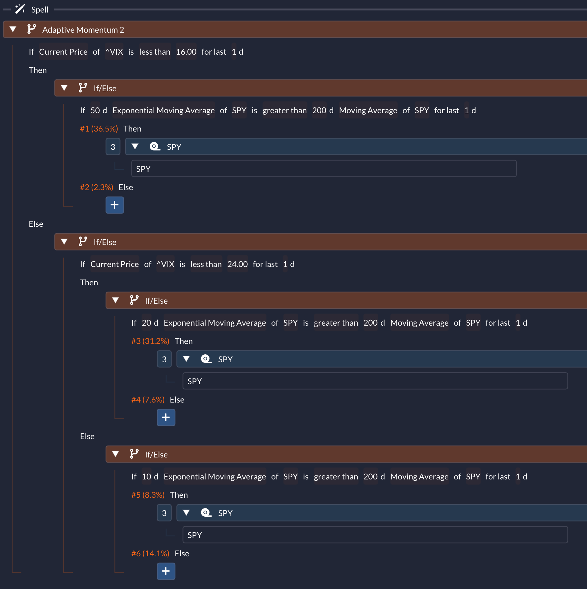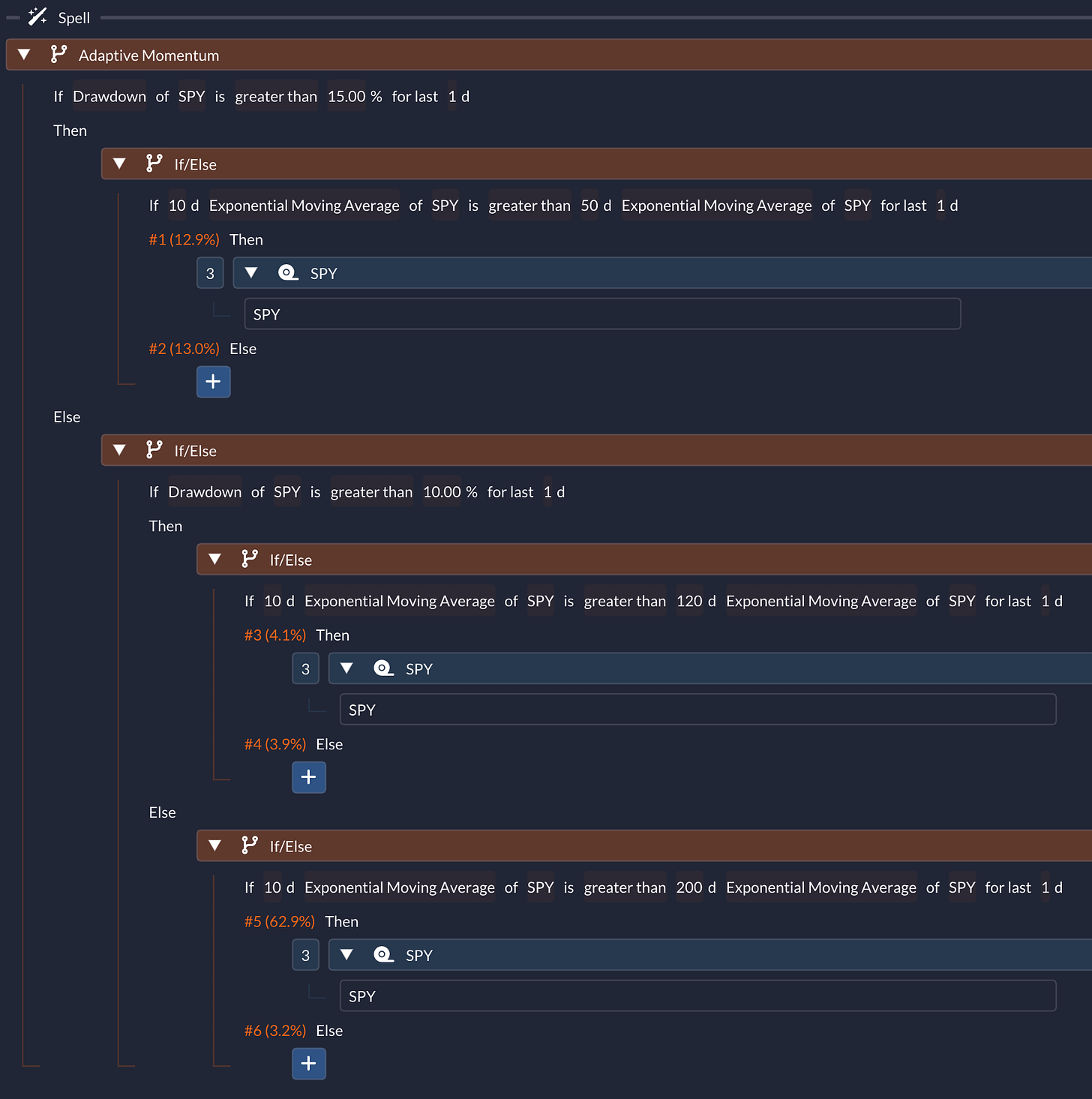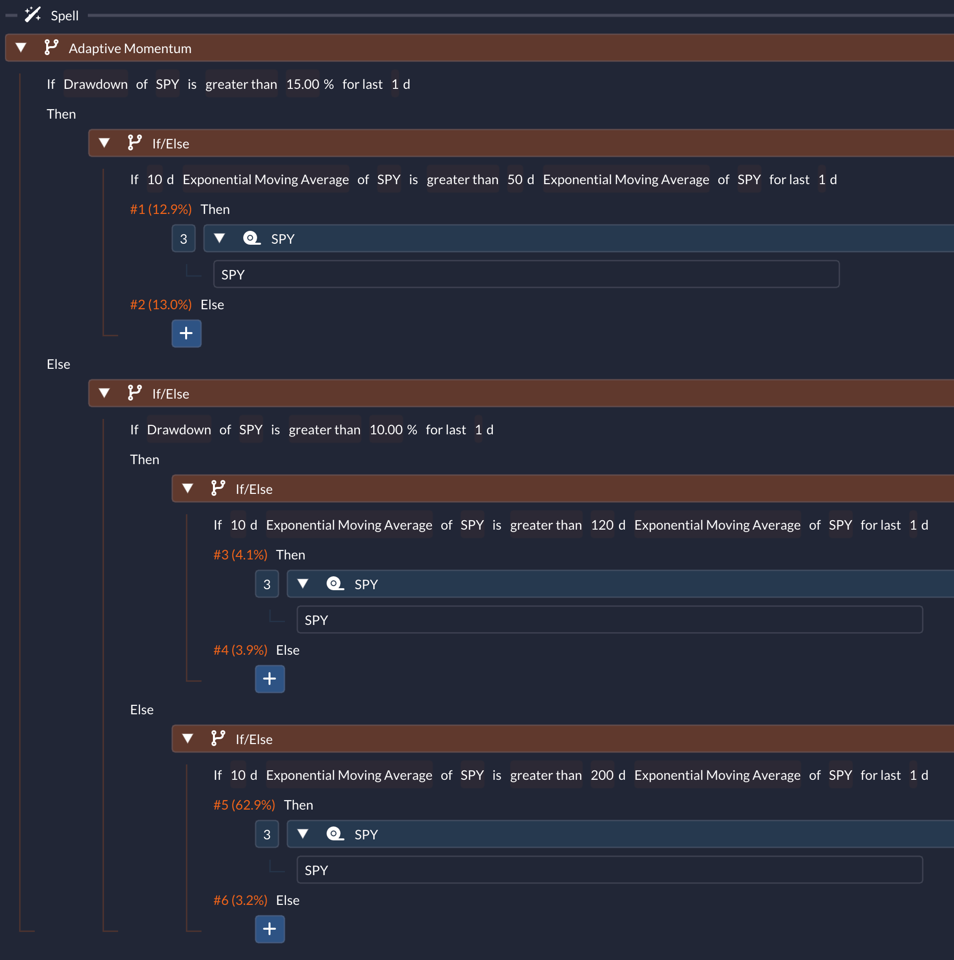 In one of Varadi’s posts, he uses the percentile ranking of drawdowns as the market variable. The gist is that the adaptive moving average slows down as the market hits new highs and speeds up after significant drawdowns. Unfortunately, since percentile ranking and adaptive moving averages aren’t available in QuantMage, I had to get a bit creative.