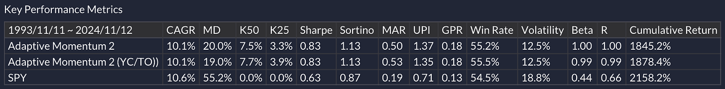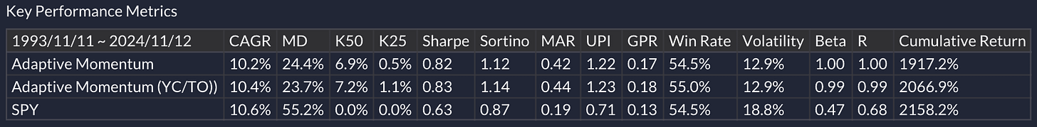 The results? Pretty solid! Over a 30-year period, this strategy achieved a Compound Annual Growth Rate (CAGR) of 10.2% with a maximum drawdown (MD) of 24.4%, all while being in the market only 80% of the time. That’s on par with a buy-and-hold strategy of the SPY but with significantly lower drawdowns and volatility. You can give the strategy a whirl here.
