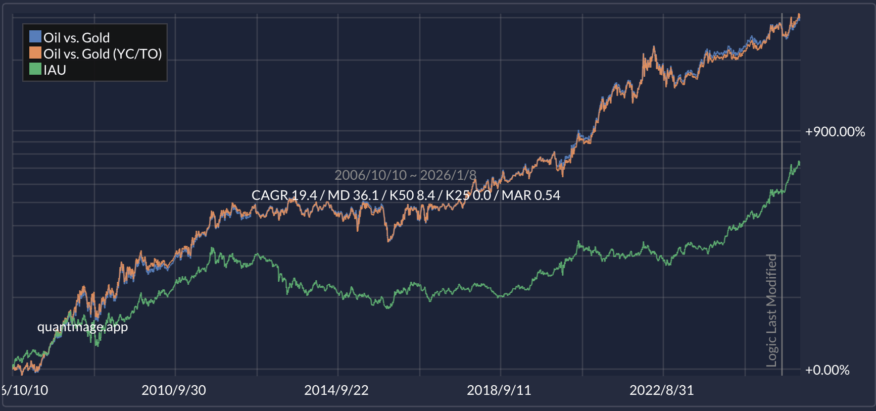 This approach uses price ratio and percentile ranking to measure IAU’s momentum against IEO (iShares U.S. Oil & Gas Exploration & Production ETF). When oil is winning the momentum battle, you rotate into USO (United States Oil Fund, LP).