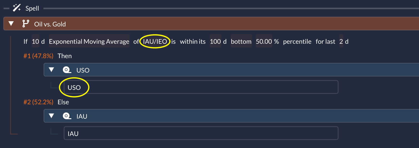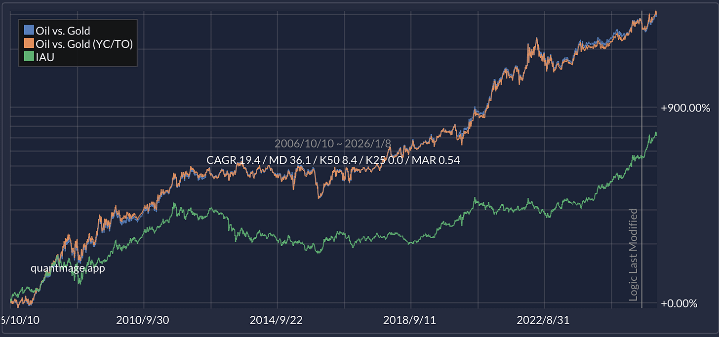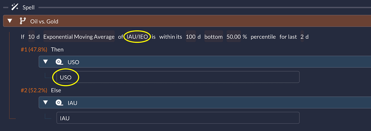 Intuition: sometimes gold and oil trade like competing “macro hedges.” This spell tries to own whichever one is acting stronger right now, instead of committing to gold as the only hedge.