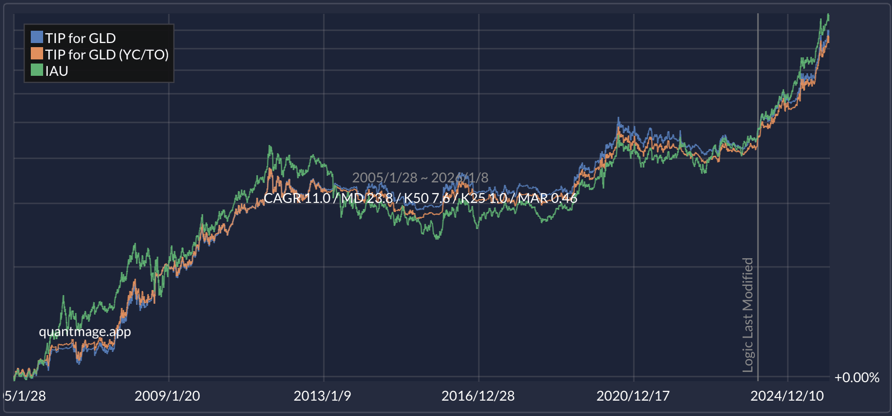 The rule: go long gold (IAU this time) when TIP’s 100-day return stays positive for three consecutive days. When that condition fails, rotate into a defensive 50/50 split between SHY and IEF.