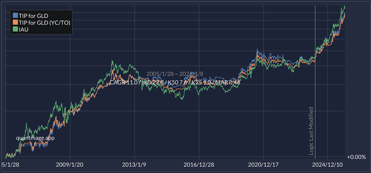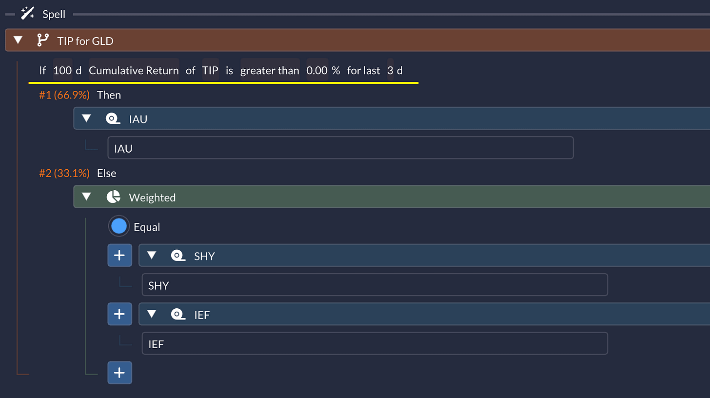 Intuition: you’re letting a “macro-sensitive” asset (TIPS) act as a gatekeeper for when you want gold exposure, and otherwise you hold a conservative bond/cash blend.