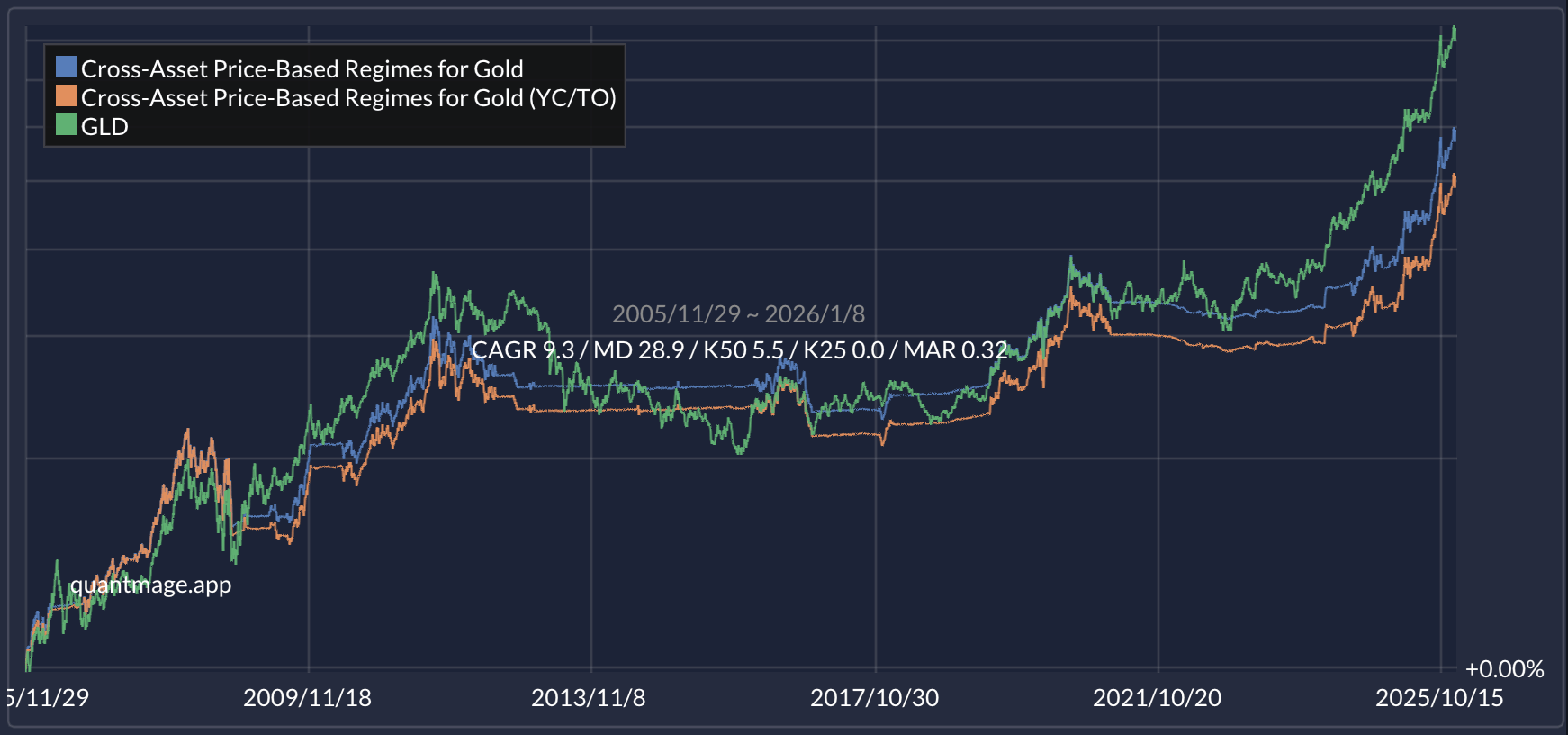 The results? Over ~20 years, this trails GLD buy-and-hold in raw return, but shows a small edge in risk-adjusted performance. It also handled ugly gold years like 2013 and 2015 more gracefully (when gold saw meaningful drawdowns).