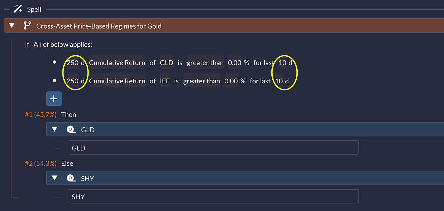 The setup is straightforward. GLD represents gold, IEF (an intermediate-term treasury bond ETF) provides the bond signal. You only hold GLD when both assets show positive momentum—otherwise, you park in SHY (cash). I’m using 250-day cumulative returns as my momentum measure, checked over ten consecutive days.