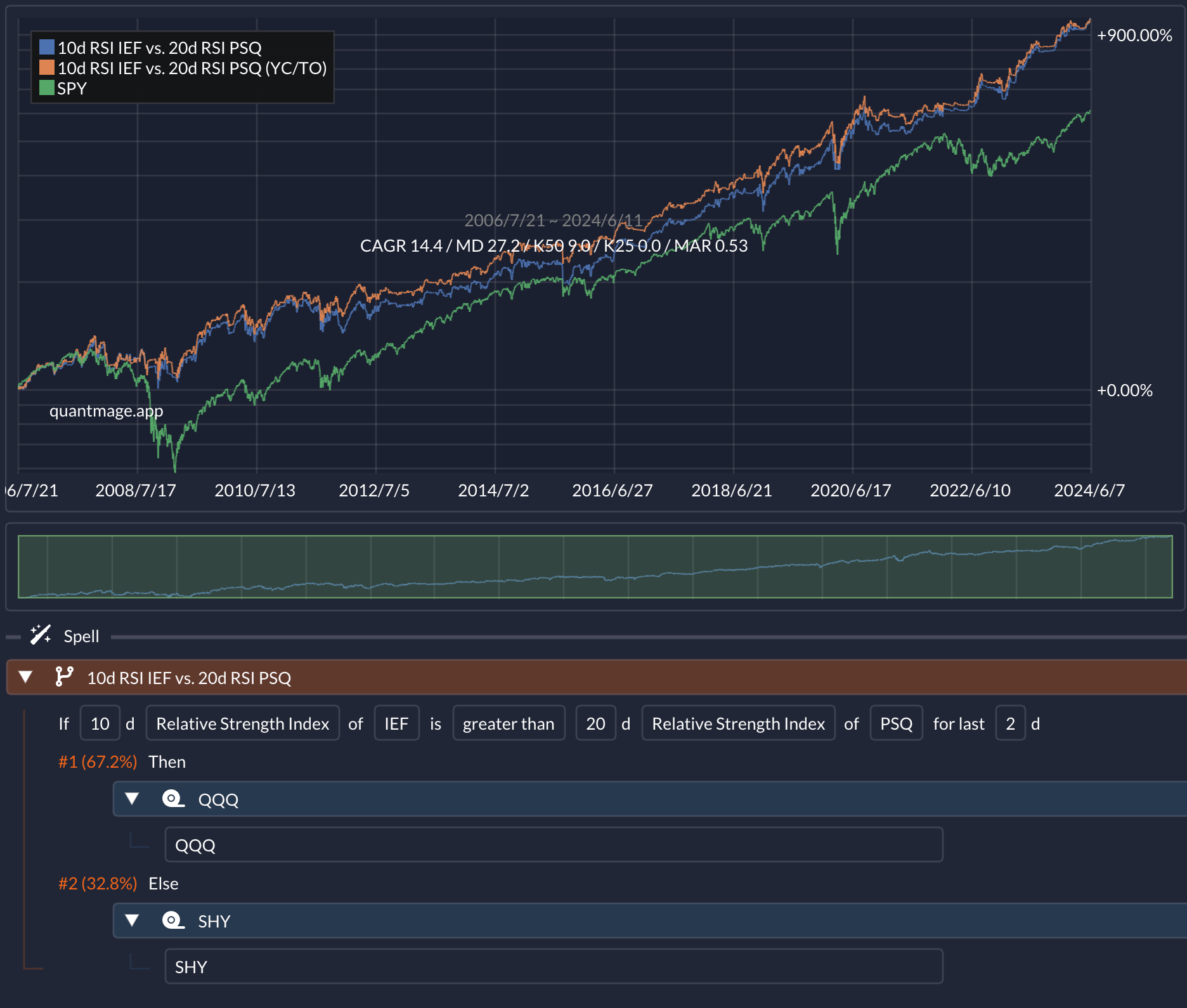 This next one is similar but uses IEF (a mid-term treasury bond ETF) instead of BND and PSQ (a short QQQ ETF) instead of SH. It also uses shorter RSI windows.