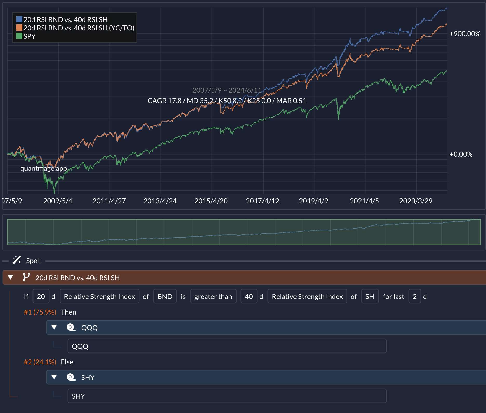 The first comparison looks at the 20-day RSI of BND (an aggregate bond ETF) against the 40-day RSI of SH (a short S&P 500 ETF). Note the longer RSI window for the short ETF, as a longer window tends to produce less volatile and extreme readings. This strategy goes to QQQ (a Nasdaq 100 ETF) when risk-on and to SHY (a short-term treasury bond ETF) otherwise. It checks their momentum over the last 2 days to get a more reliable risk-on signal.