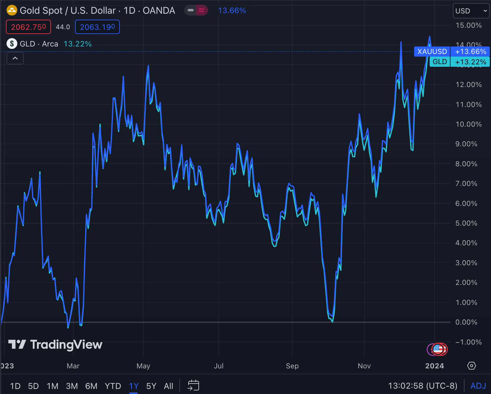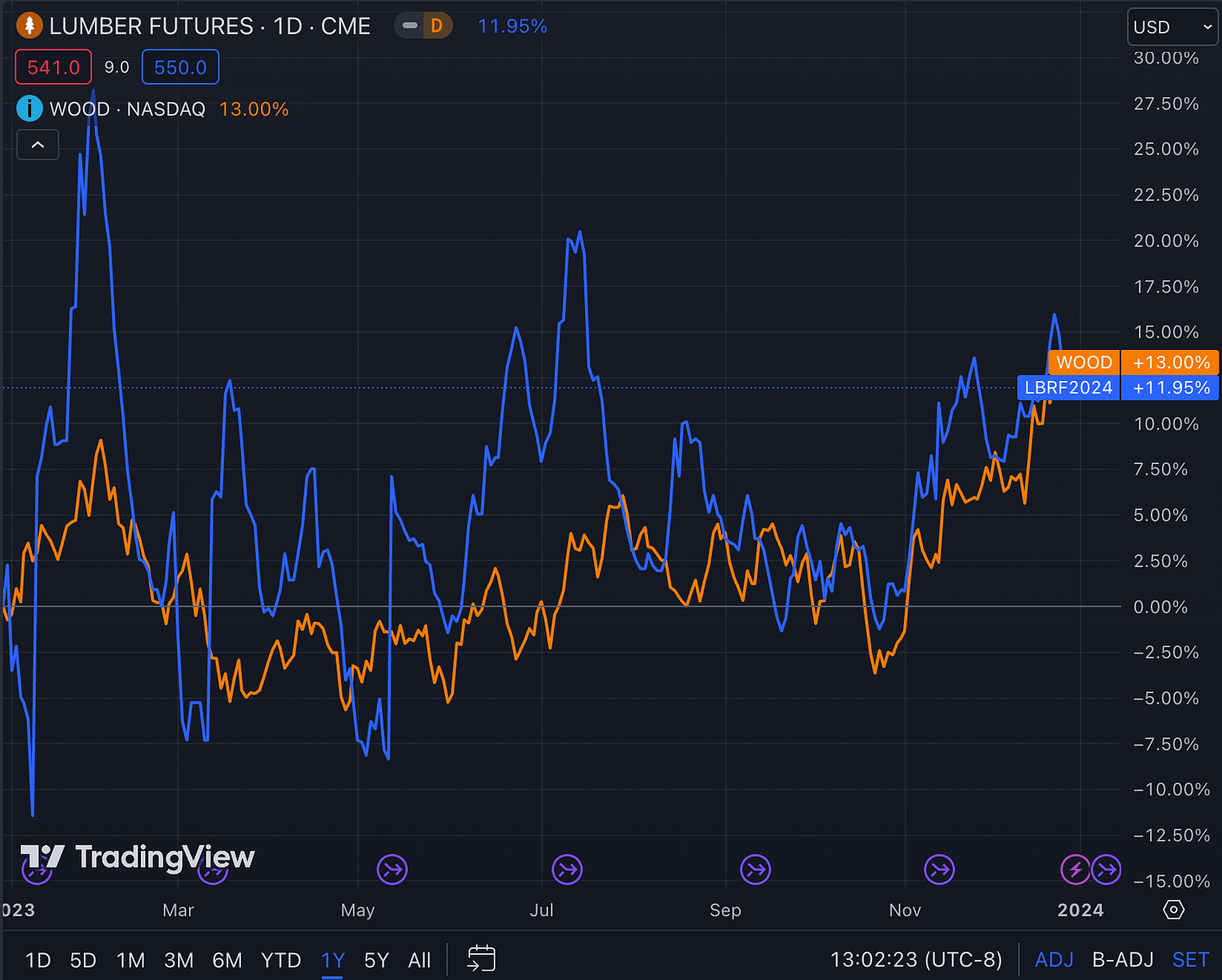 A quick heads-up: the WOOD ETF is somewhat of a rough sketch of the actual lumber futures index. It's in the ballpark but doesn't mirror it move for move. On the flip side, the GLD ETF does a pretty solid job tracking the XAU.