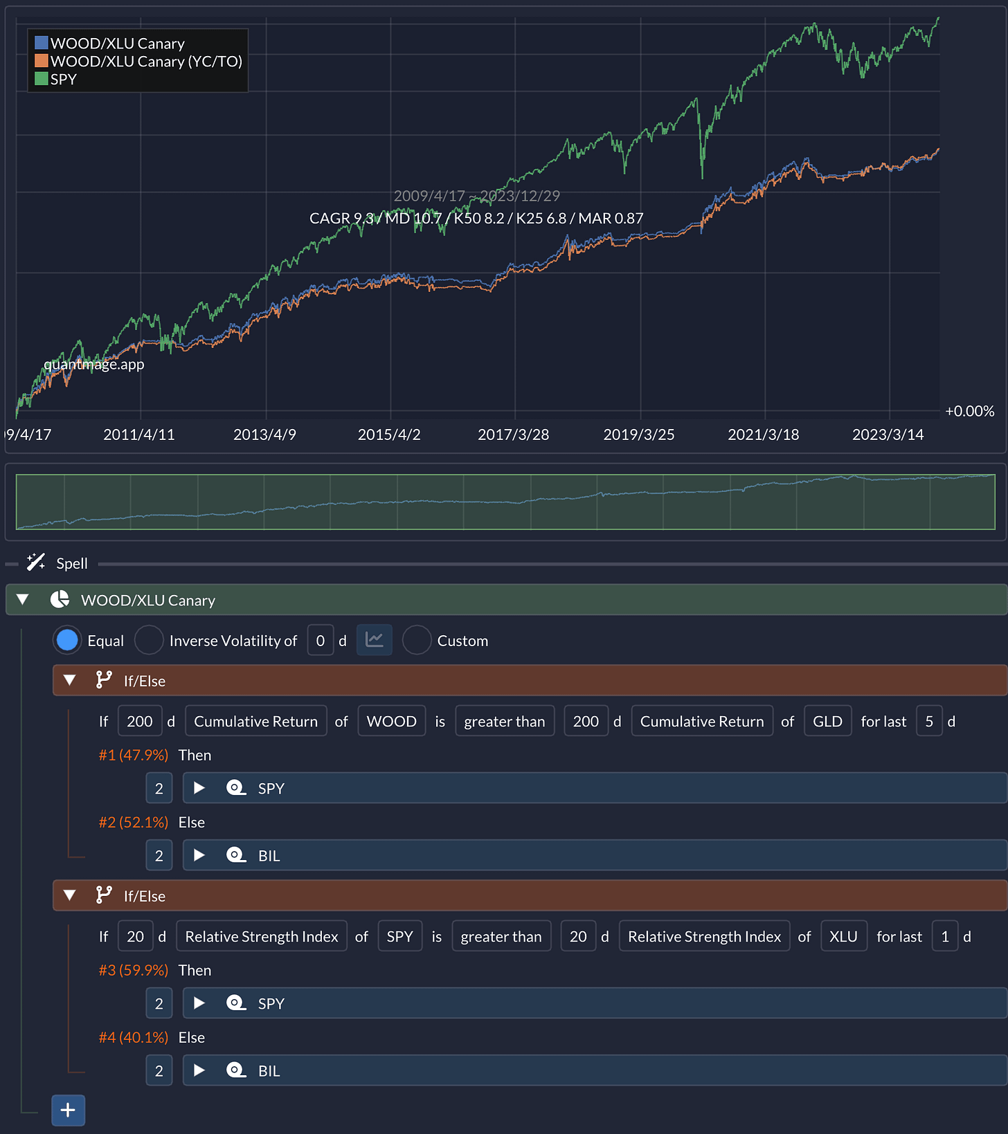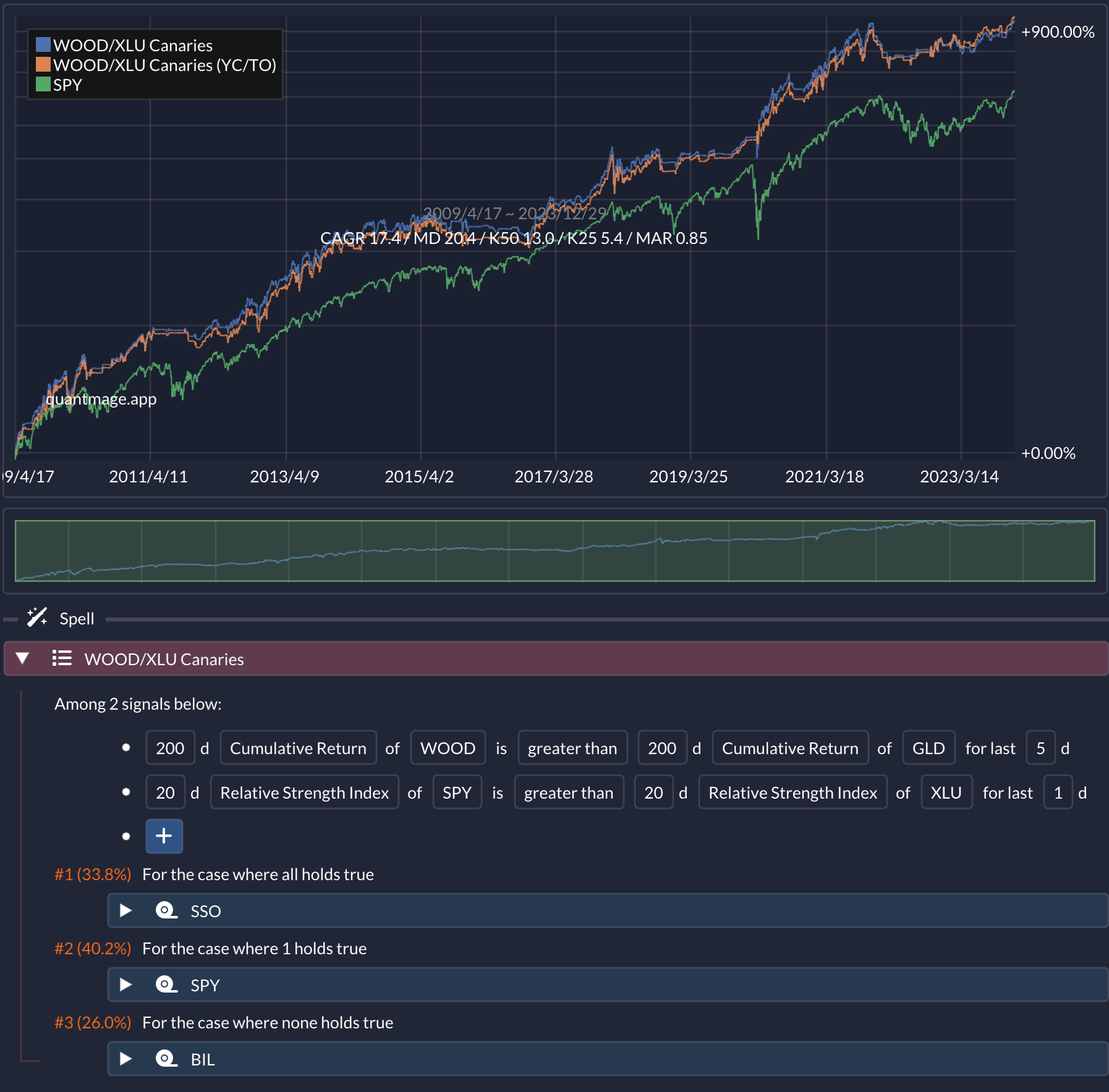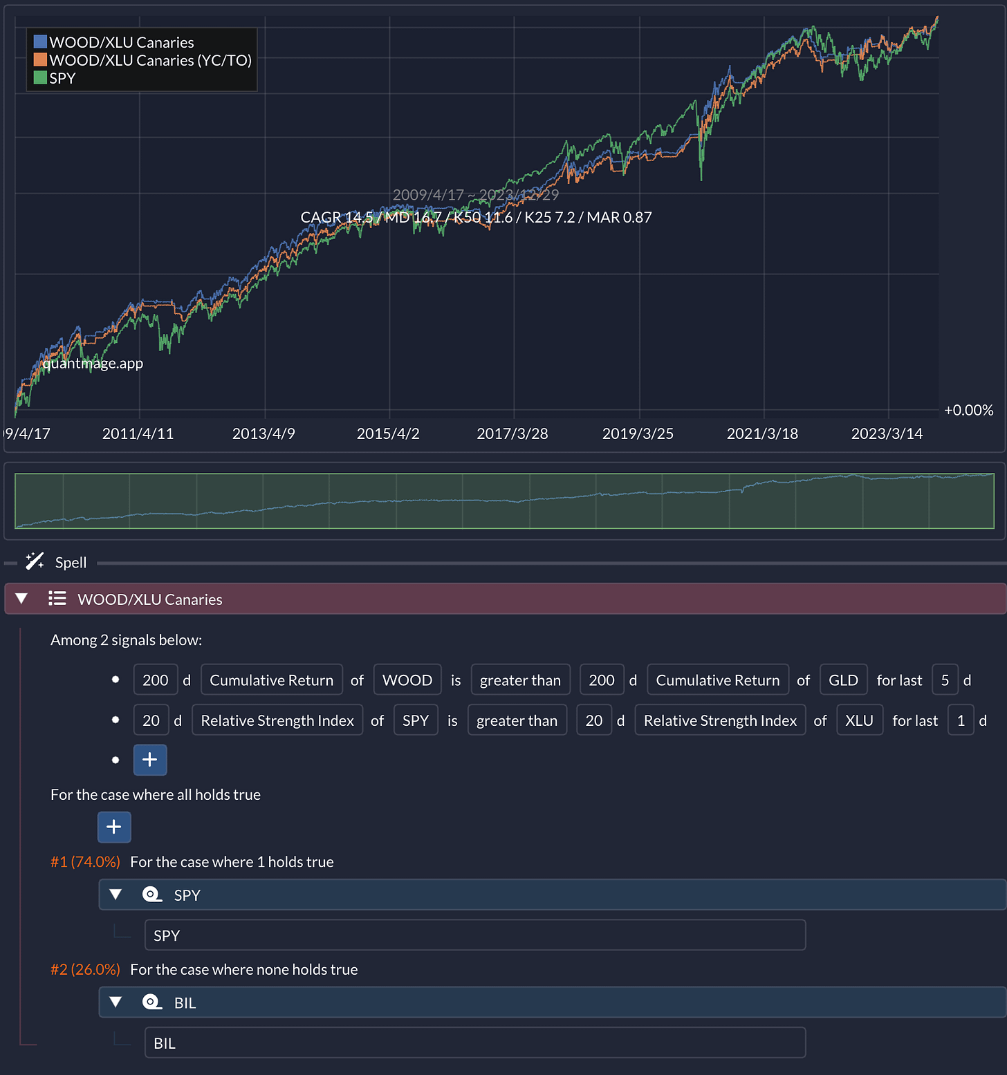 I ran this through QuantMage, with SPY representing the broad market and XLU the utilities sector. The results weren't as stellar as the lumber-gold pair, mainly due to the harsh hit during the great recession (something the younger WOOD ETF didn’t face):