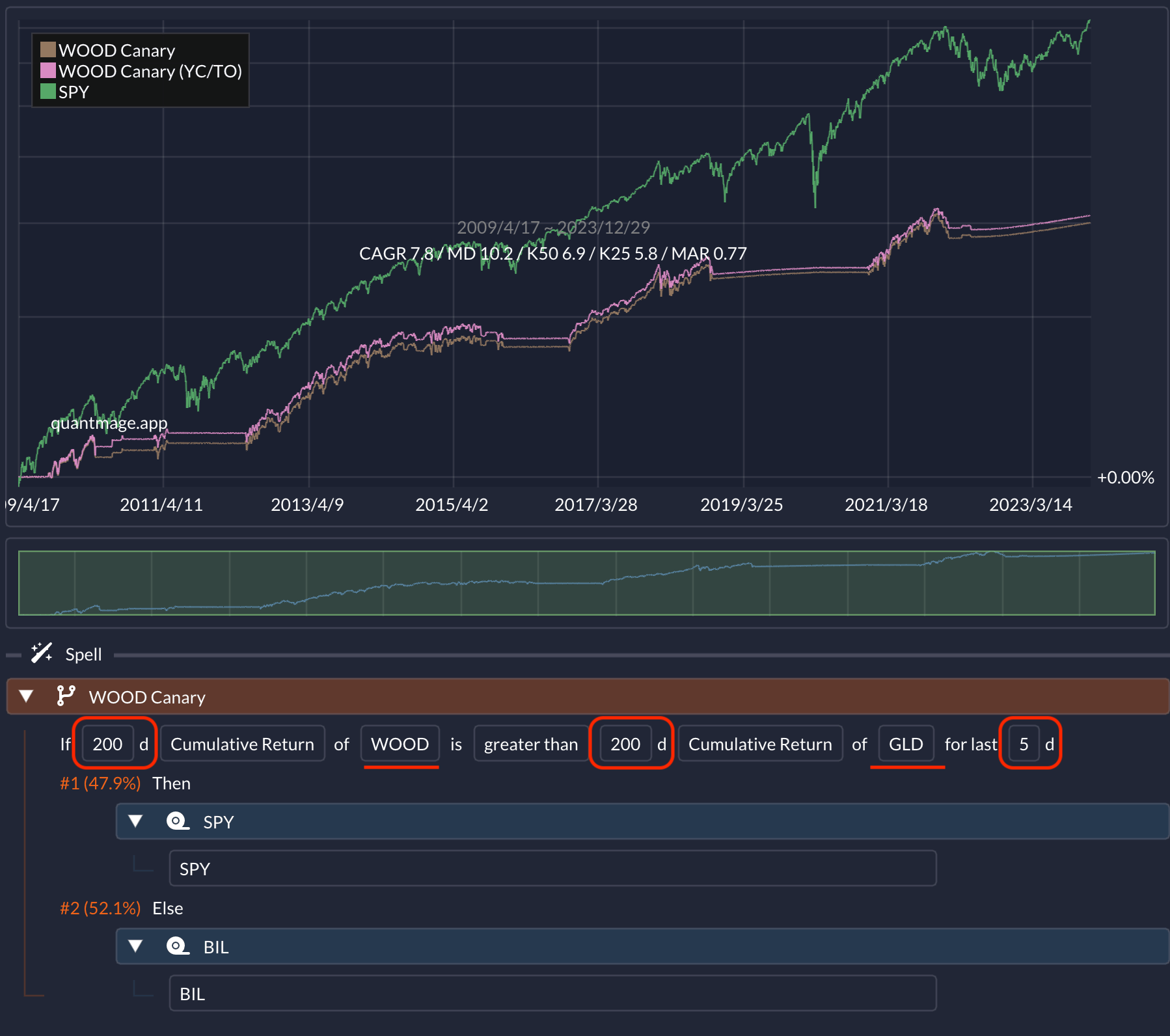 Instead of actual lumber futures, I used the WOOD ETF (a close cousin, but not a twin). Similarly, GLD ETF stepped in for the gold spot index, XAU. I also stretched the look-back period to 200 days and waited for the signal to hold steady for 5 consecutive days before triggering. And, oh, I opted for threshold trading rather than the weekly rebalancing suggested in the paper. The result? A CAGR of 7.8% and a Max Drawdown of 10.2%. Not too shabby, right?