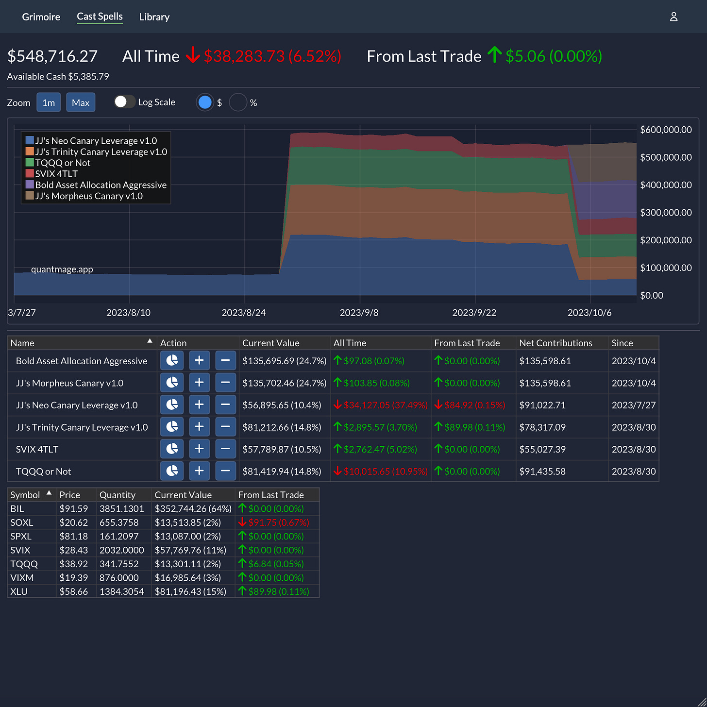 I kicked off with QuantMage at the end of July. Got serious by August's end and did some rebalancing after integrating two new strategies (or "spells", as we call them in QuantMage-speak) by early October. As of 10/12/2023, I'm down 6.52%, compared to SPY's 4.2%. Yep, I'll be upfront about the lows and highs. Stay tuned as I share more about my evolving investment strategies and the continuous growth of QuantMage.