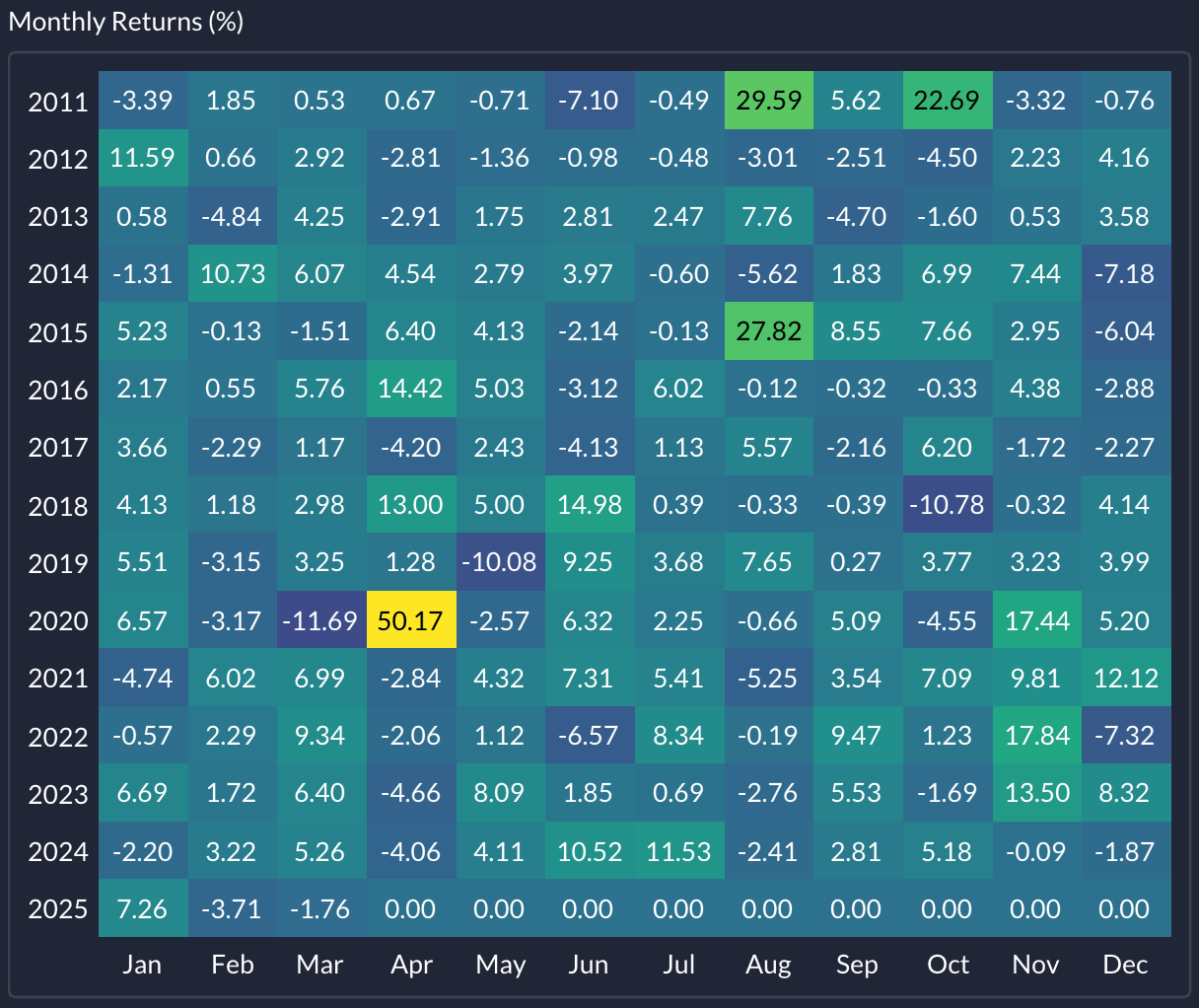 We're talking an impressive compound annual growth rate (CAGR) of 35.3% over 14 years—without leverage—plus a manageable max drawdown of 28.5% and volatility of 24.6%. That's genuinely notable, especially since there hasn’t been a single negative year: