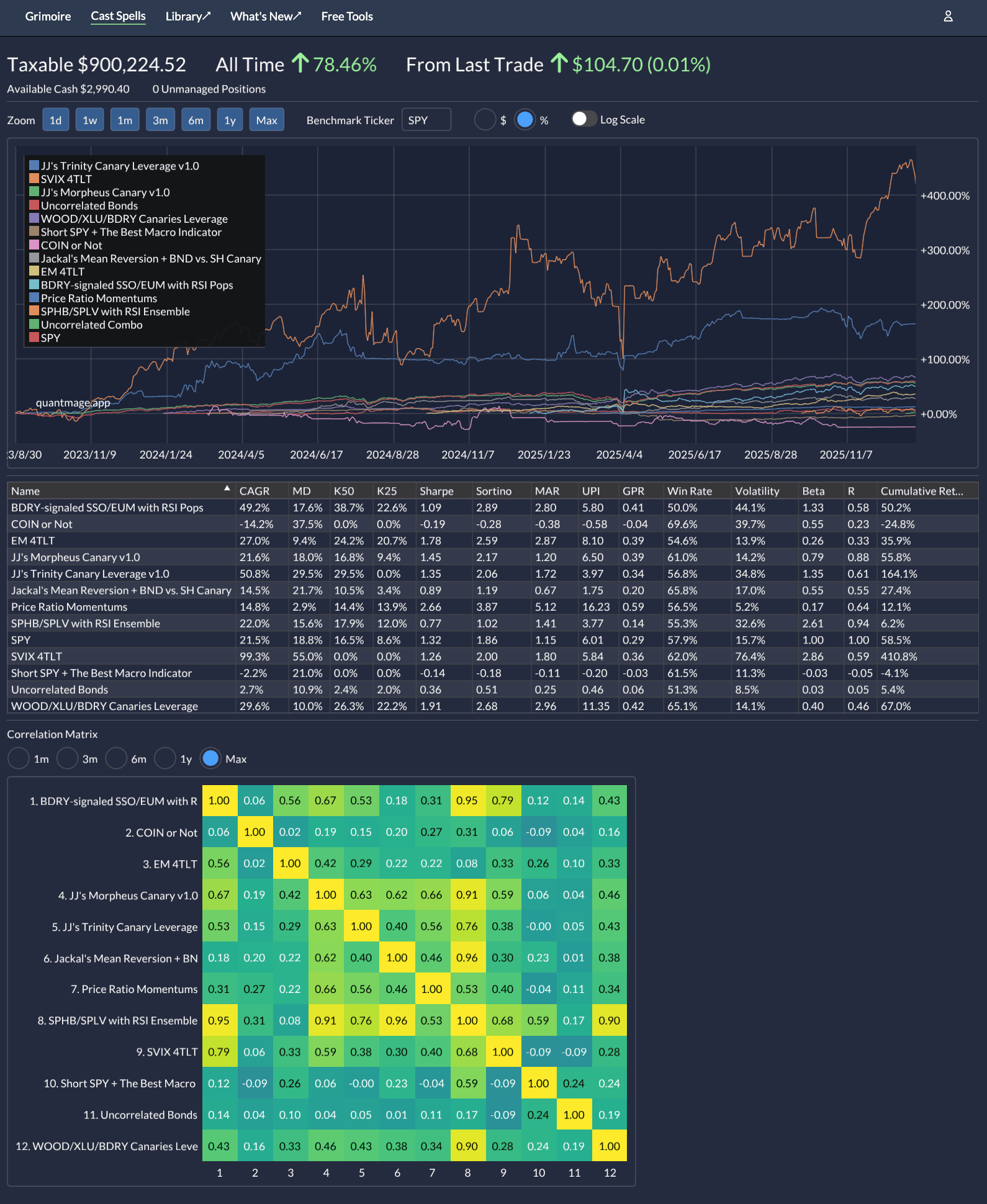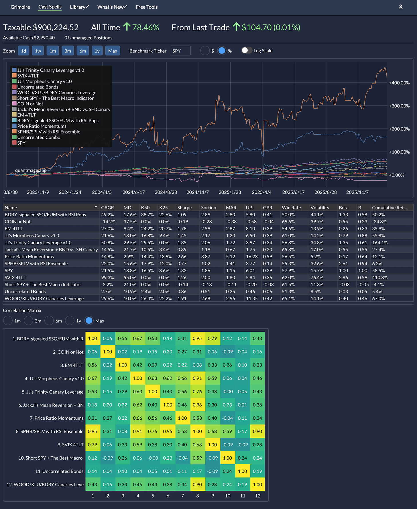 You’ll notice a change in the lineup: I’ve retired the KMLM Canary Combo and replaced it with what I’m calling the Uncorrelated Combo. The appeal? Near-zero correlation to the broader market, paired with high-teen CAGR over 18 years of backtesting. On paper, it’s exactly what I want. In practice? The proof is in the pudding—stay tuned.
