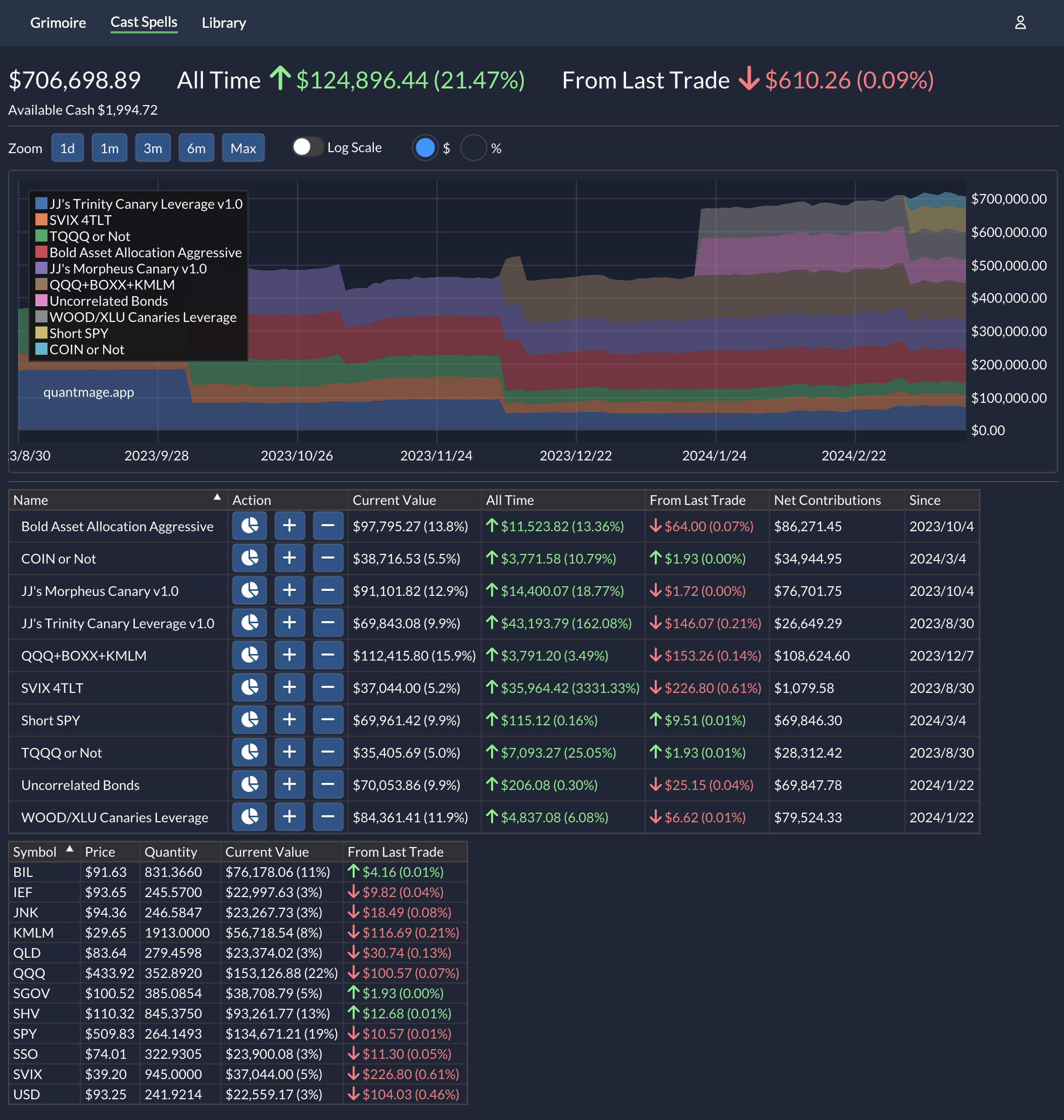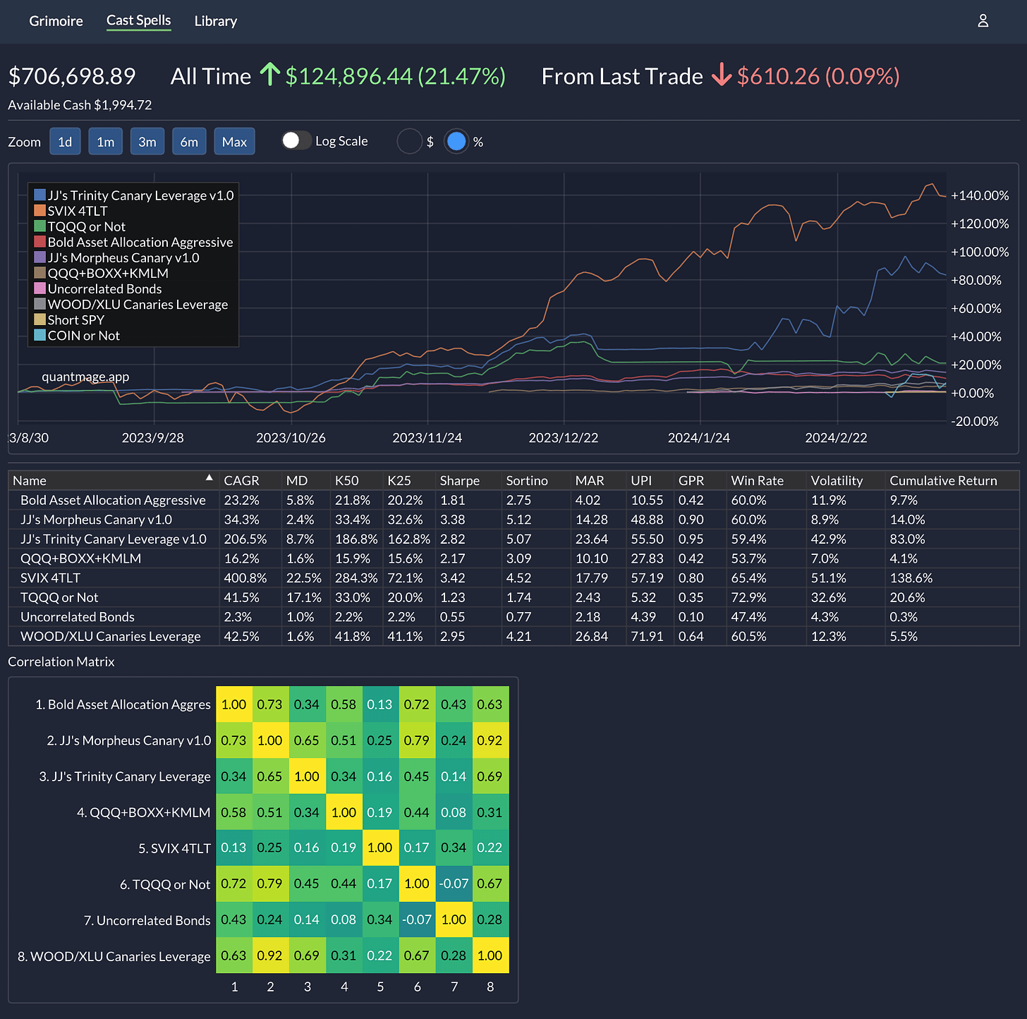 Since my last update, there's been a bit of tinkering on my end. I've dipped my toes into a crypto strategy dubbed COIN or Not, adding a sprinkle of excitement, as fleshed out in my previous post. Additionally, I beefed up my volatility play with another strategy, aptly named Short SPY. Coupled with the existing Uncorrelated Bonds, these long volatility strategies now make up about 20% of the portfolio. I'm banking on them to serve as a reliable safety net when the market decides to take a nosedive, despite their modest gains during bullish runs. Both were inversely correlated to SPY and they complemented each other quite nicely in my backtests. However, the true test will come when the market faces its next big challenge. Stay tuned for a deeper dive into these strategies in the posts to come.