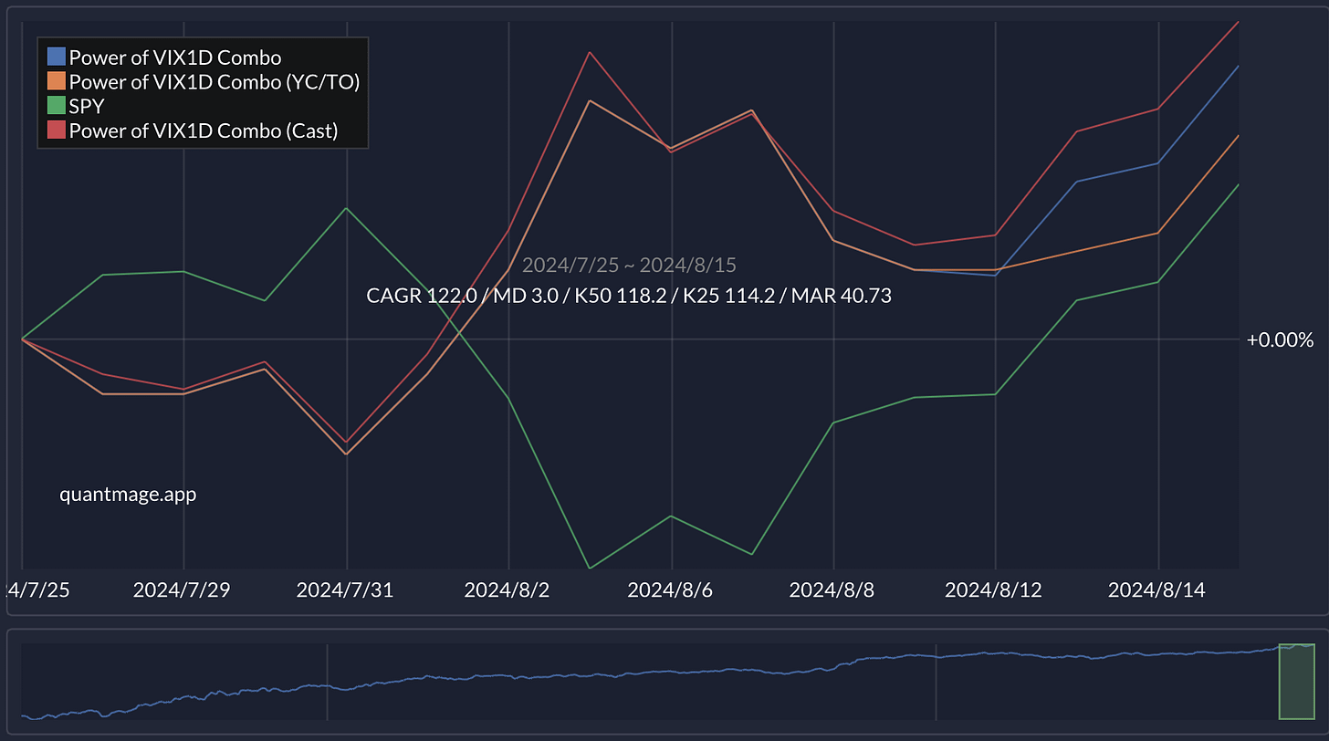 In response, I made some key adjustments. I fine-tuned multiple strategies that rely on volatility ETFs—removing the use for the ones that I felt weren’t nimble enough to handle sudden market swings and adding VIX-based safety checks for the rest to reduce the odds of landing in the wrong trade. I also introduced a new strategy that uses VIX1D as a sort of canary in the coal mine, which offered some protection during last week’s turbulence. Given its short backtesting history, though, I’ll be keeping a close eye on it for now.