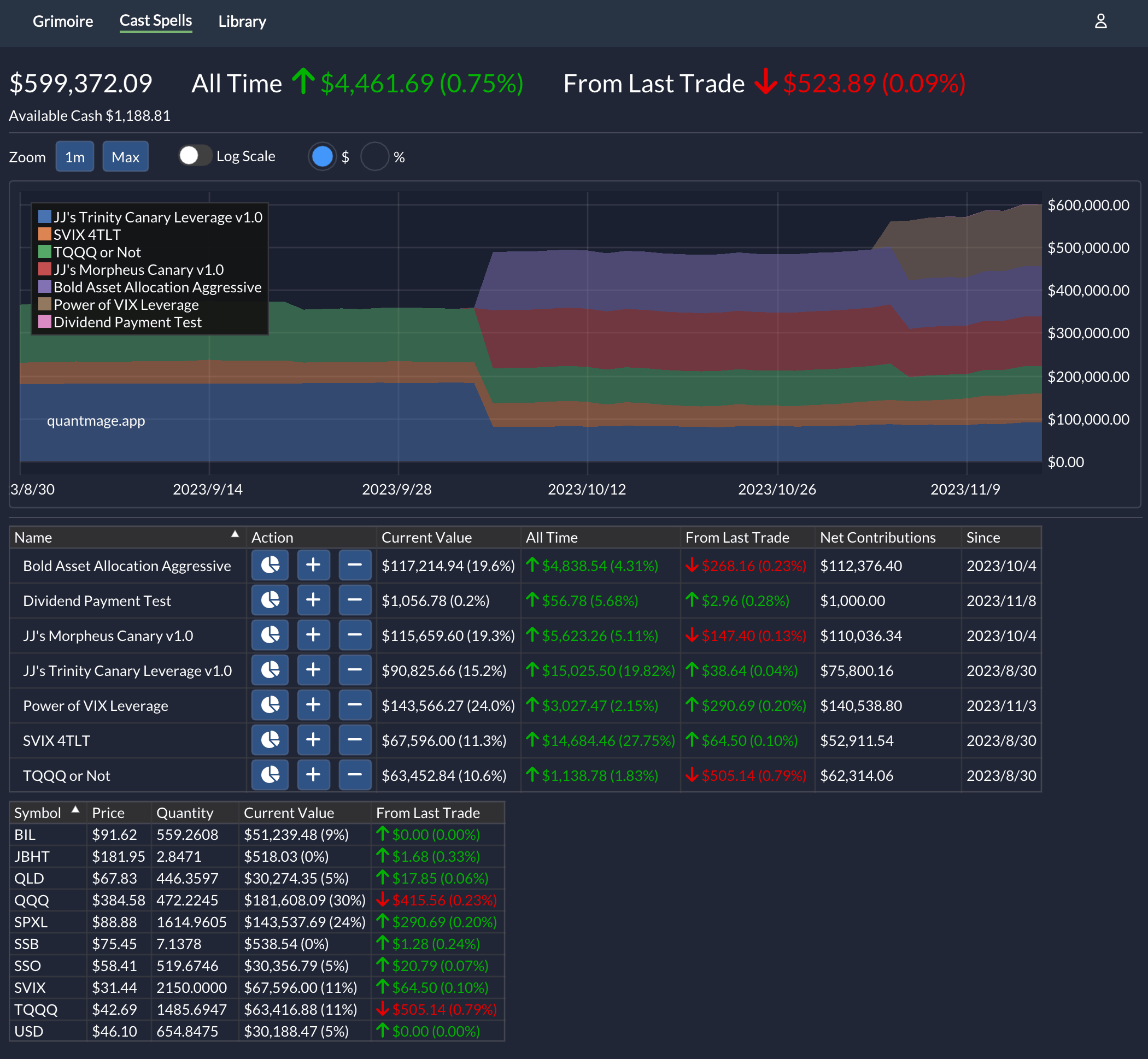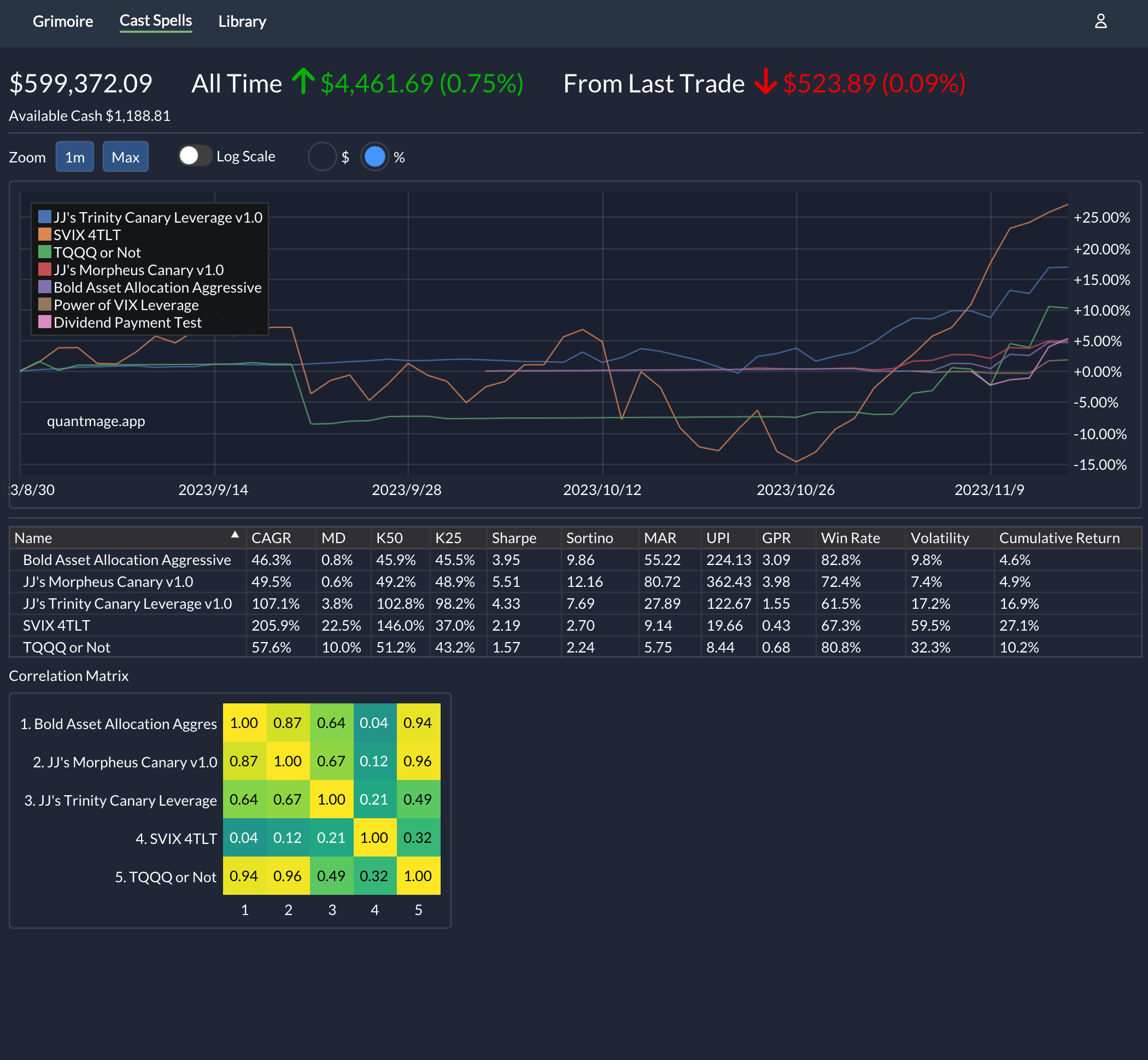 But hey, it's not just the market tides lifting my boat. I've been busy tweaking things around in my portfolio. Wave goodbye to JJโs Neo Canary Leverage v1.0 and say hello to the new player in town: Power of VIX Leverage. Plus, I've done some neat rebalancing, sizing up positions roughly based on their volatilities.