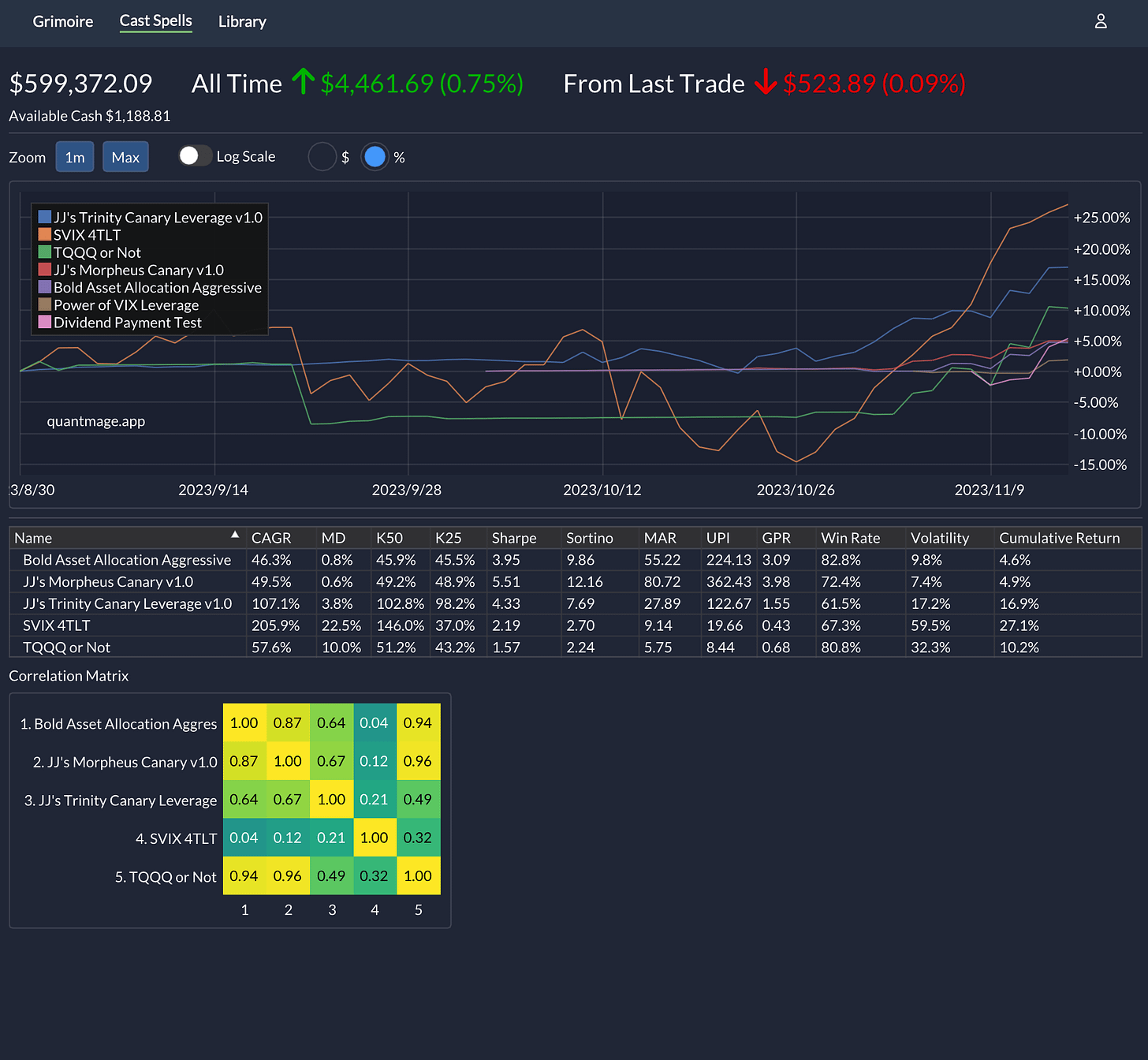 The VIX spell isn't on the board yet โ it's still a bit too fresh. And remember, these stats are still in their early days, so let's not etch them in stone just yet. Interestingly, Bold Asset Allocation Aggressive, JJโs Morpheus Canary v1.0, and TQQQ or Not are showing some dance moves together (read: correlation). But let's keep an eye on them and see if they continue to tango over time.