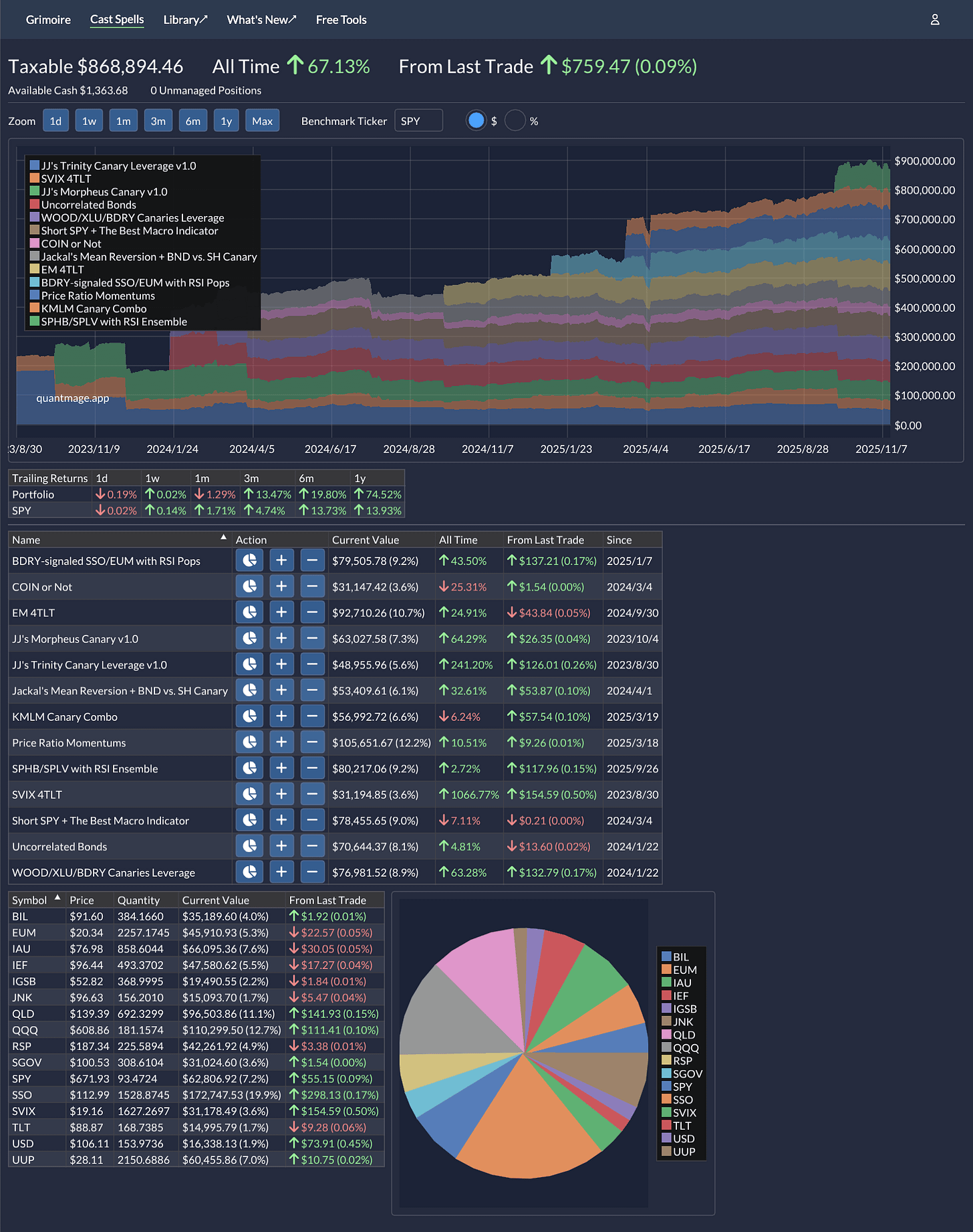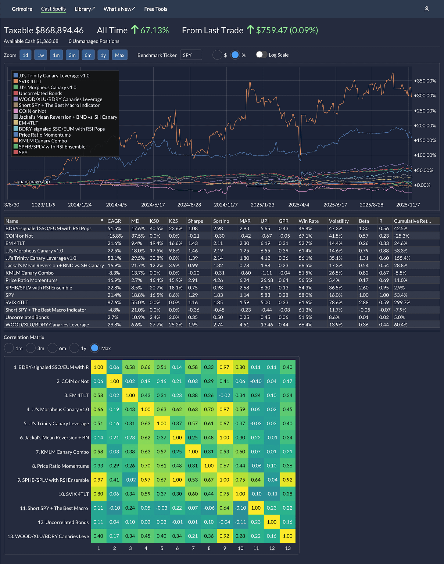 Crypto didn’t get the memo about “Uptober” or “Moonvember” either, and my COIN or Not strategy extended its losing streak. The bright spot: the new entry, SPHB/SPLV with RSI Ensemble, has been behaving nicely so far and offering at least a bit of performance relief.