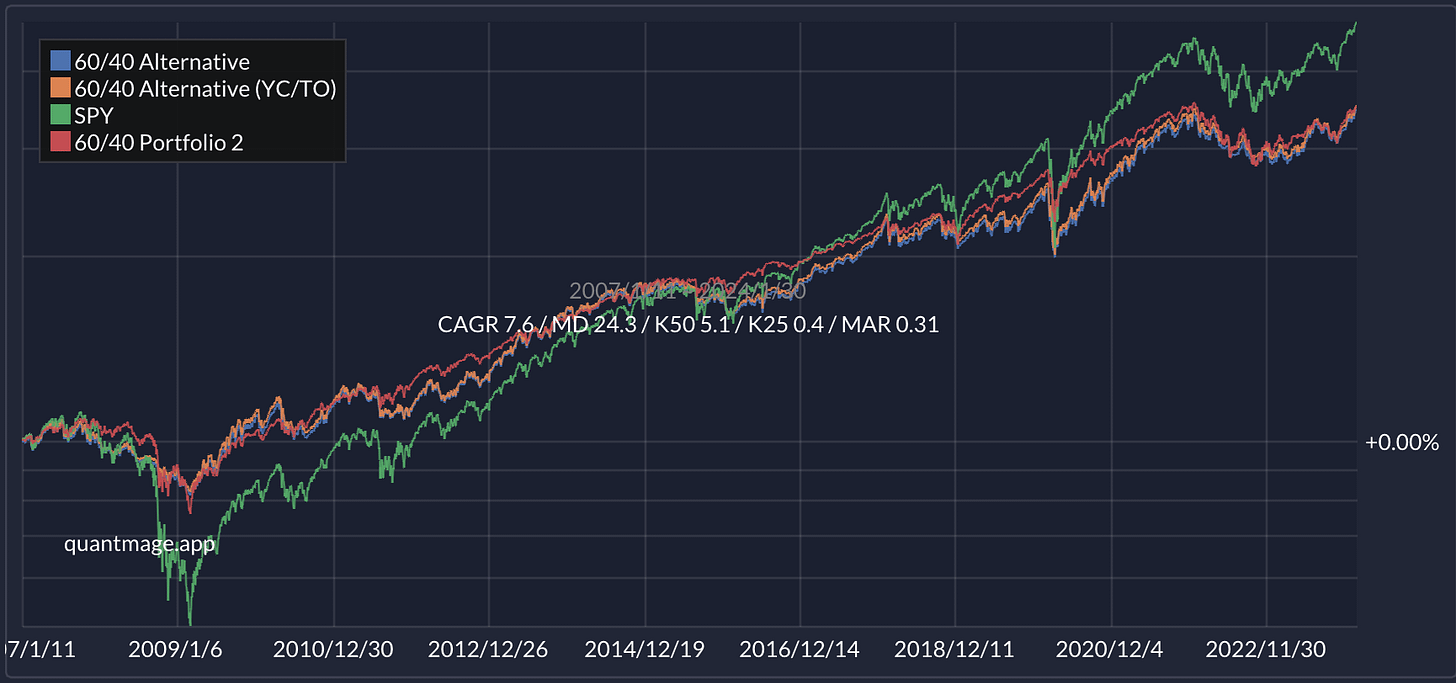 We've all been schooled on the classic 60/40 Portfolio – a blend of 60% equities and 40% bonds, hailed as the beginner investor's North Star. For a quick recap, check out these two implementations on QuantMage here and here. But let's talk real: 2022 was a wake-up call. The bond market, once a reliable ally, stumbled spectacularly, challenging the long-held belief of stocks and bonds moving in opposite directions. Enter inflation post-COVID stimulus, and it seems the rulebook needs rewriting. Is the 60/40 Portfolio now a relic of the past? Maybe, but what's the alternative?