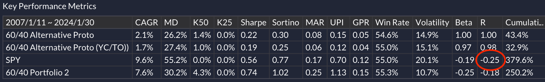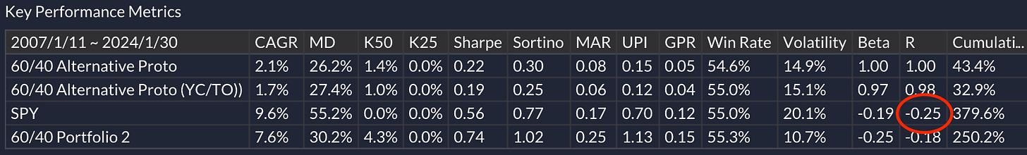 But does this strategy truly offer low correlation with SPY? The proto version, when weighted 100% towards the long/short section as follows: