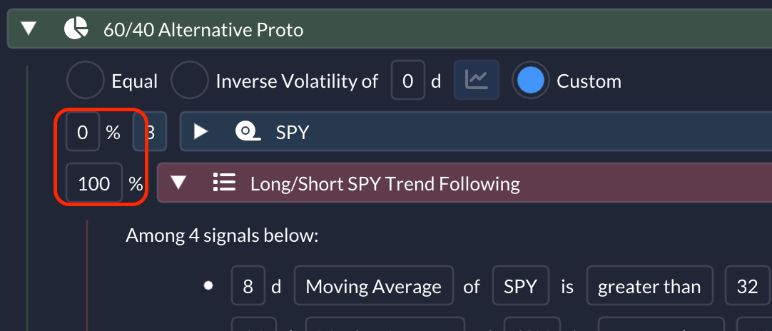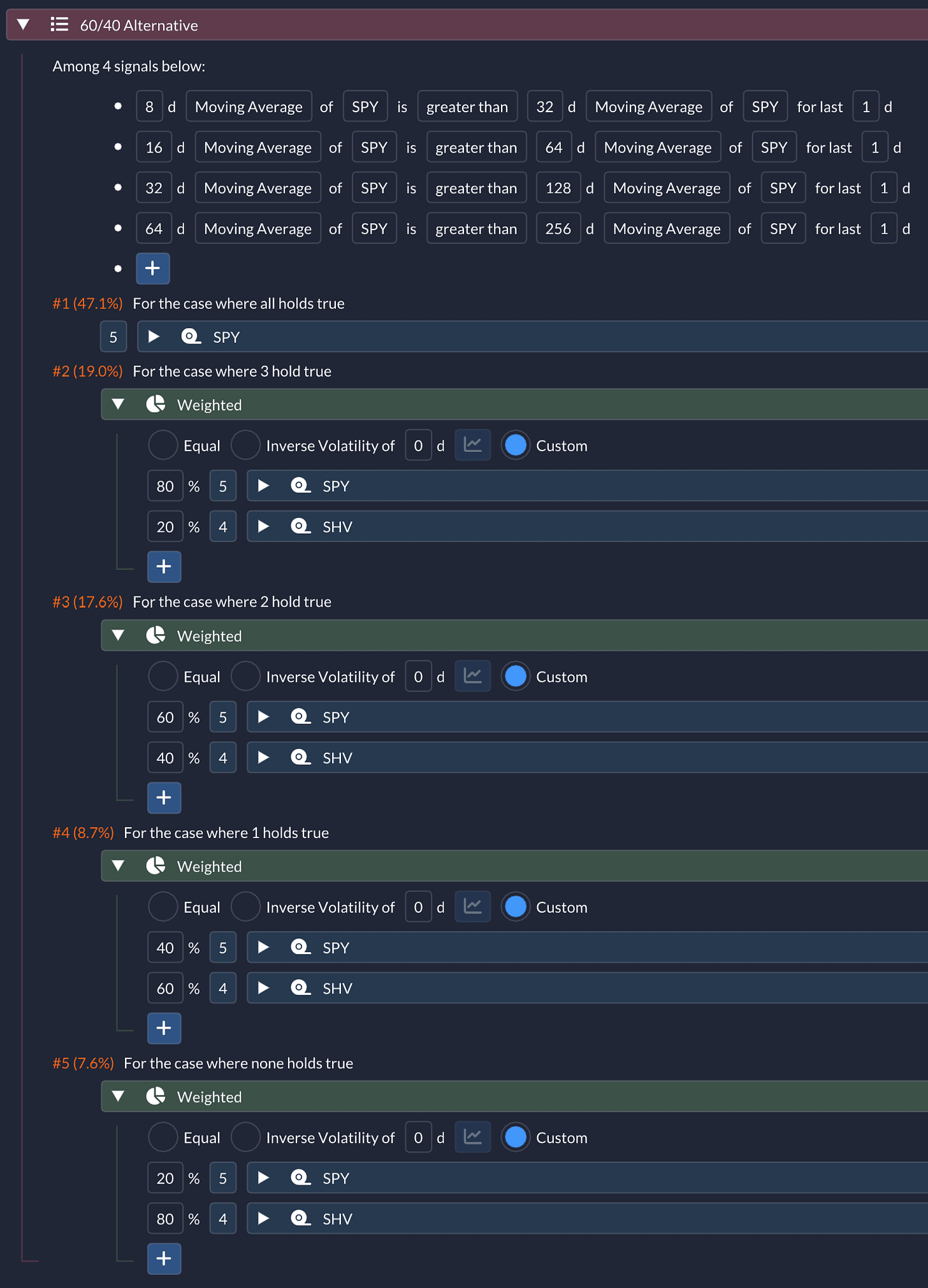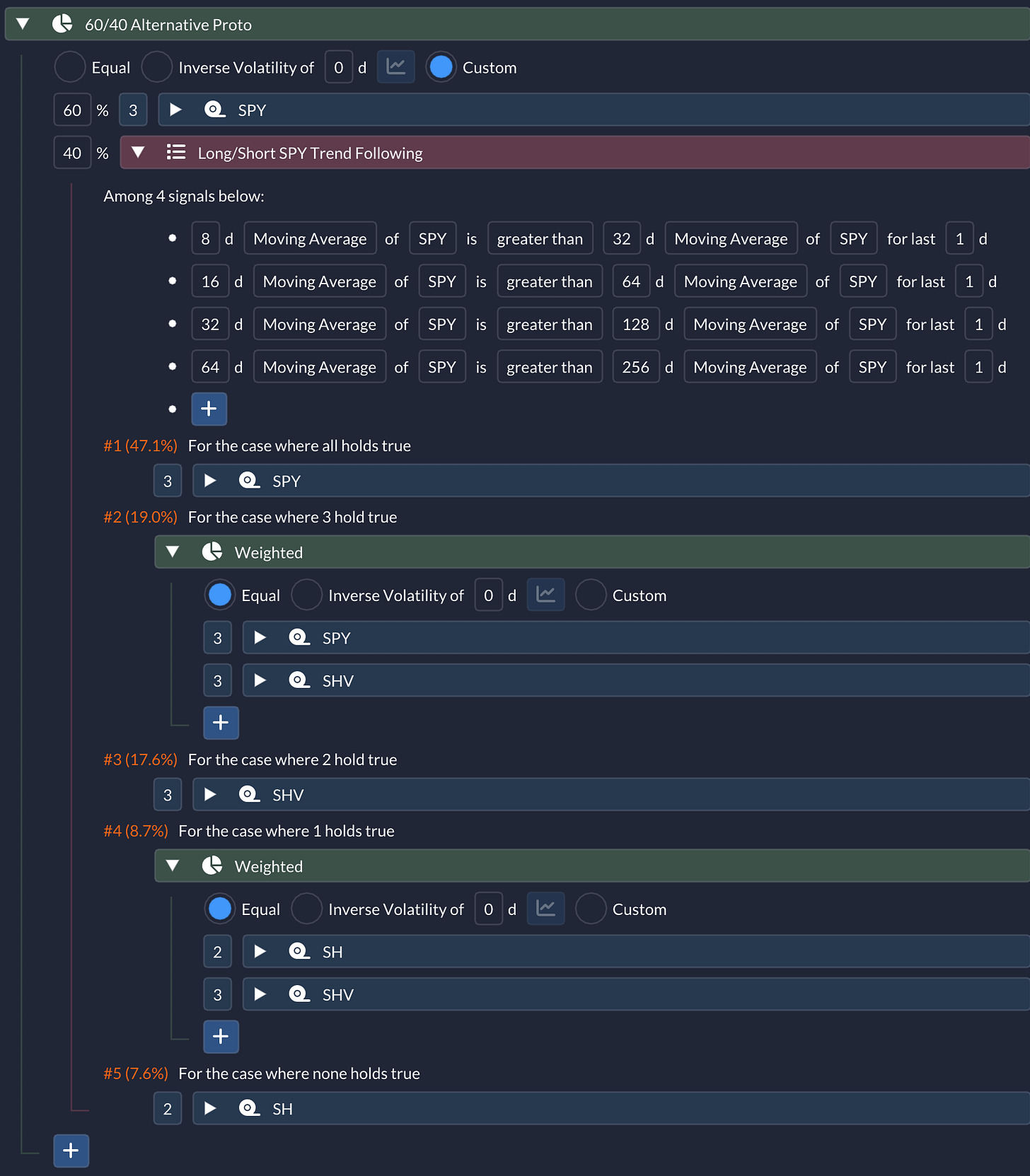 Here’s the gist: the trend following uses 100% long when all 4 signals are bullish, 50% long + 50% cash when only 3 signals are bullish, 100% cash for 2 signals only, 50% short + 50% cash for 1 only, and 100% short when none is bullish. You can merge long and short sides together when 40% of this is combined with 60% equity portion to form a final 60/40 alternative as described in the article. This results in a simplified logic as below: