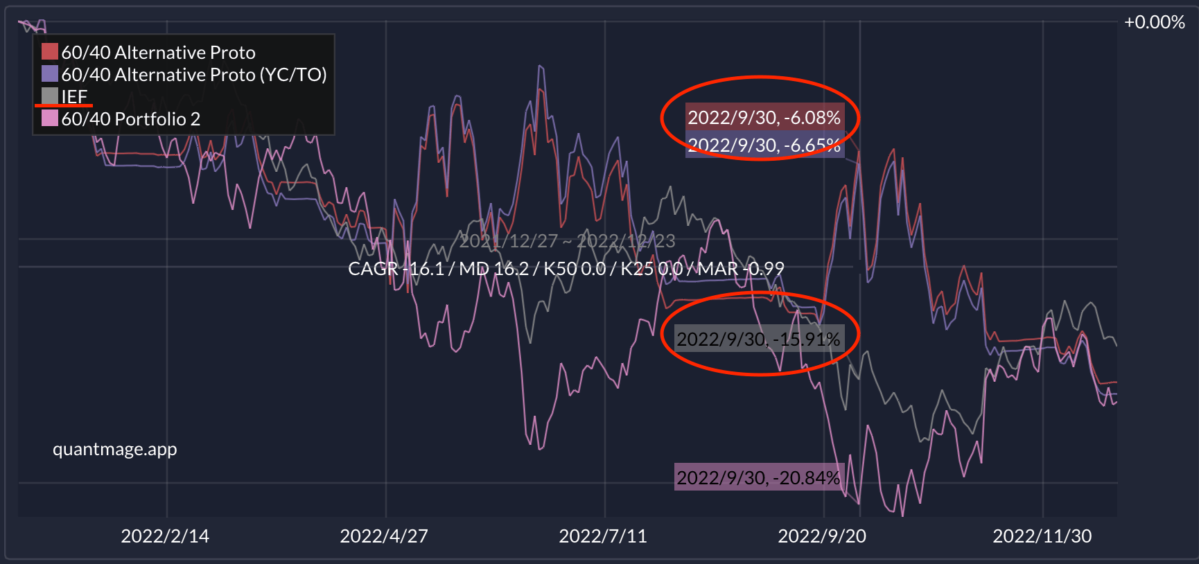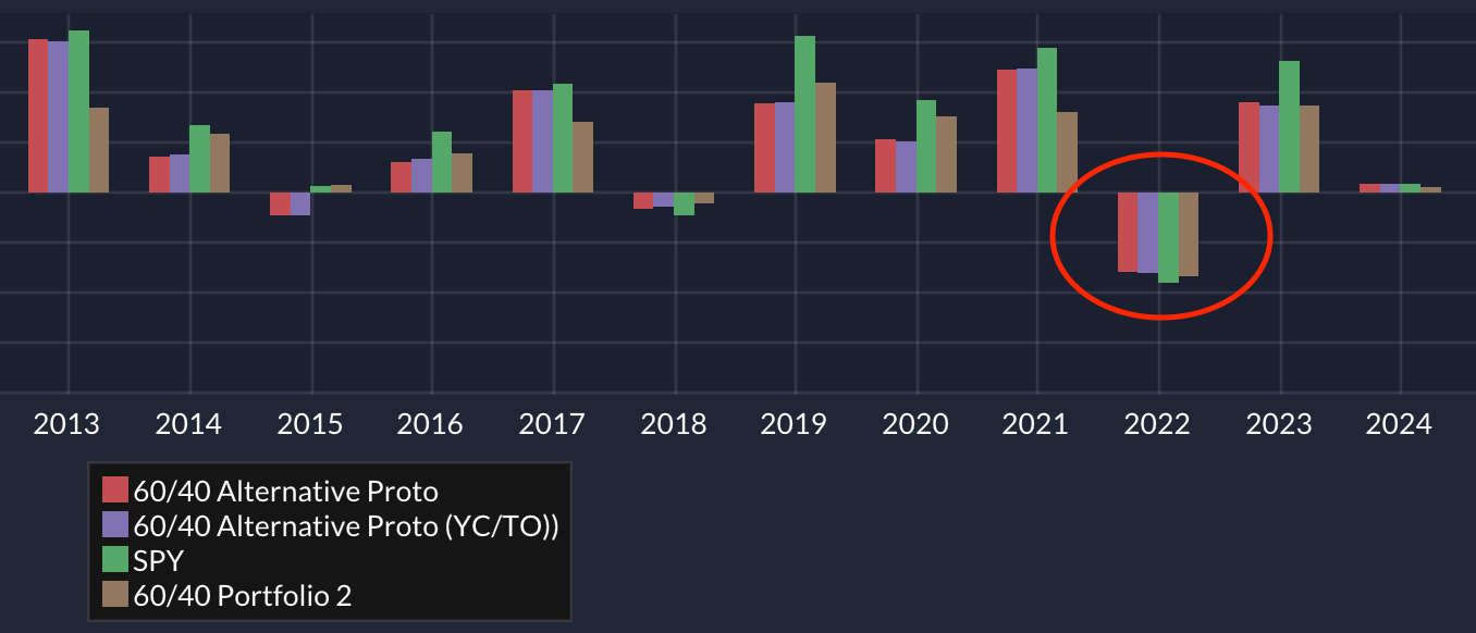 It indeed fared better than the bond! It ended up at a similar drawdown as the classic 60/40 for the whole year, though. Check the following yearly returns in the stats once you rerun a backtest after reverting the temporary changes: