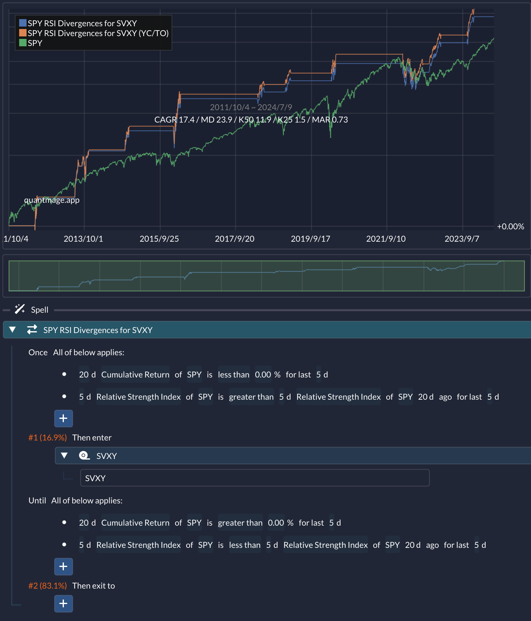 For a 13-year period, it pulls off an impressive annual return of 17.4% by being in the market only 16.9% of the time! You might ask why we’re using SVXY instead of SPY (or any other risk-on assets for that matter). The answer is I didn’t find any other assets that give me a decent result when used in place of SVXY. 😅 Give the strategy a try here.