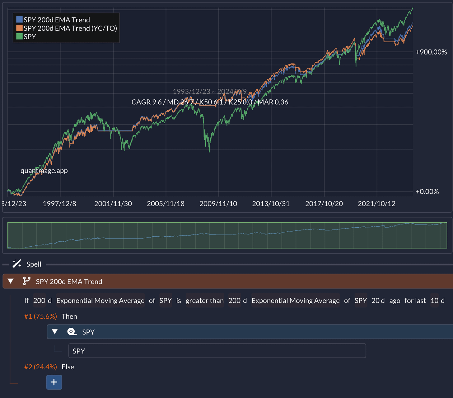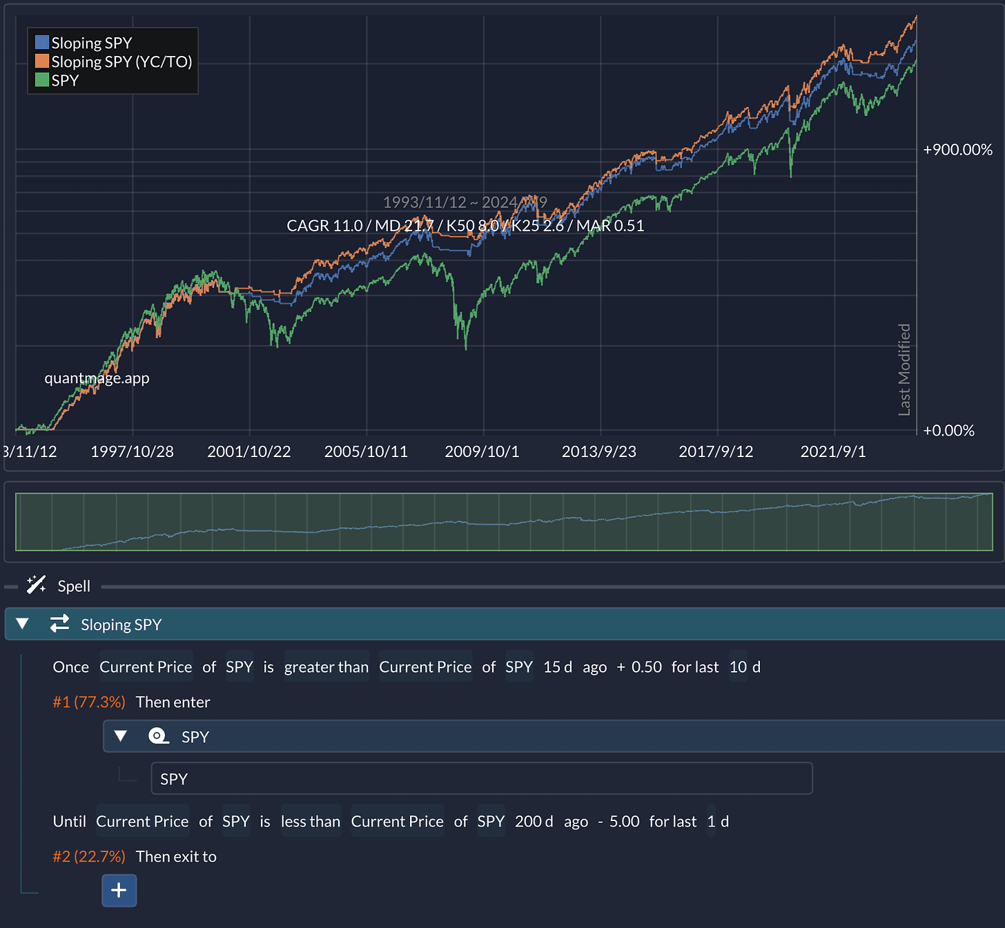 This idea checks price changes over certain periods to determine entry or exit. Basically, it’s like checking how steep the approximate slope of the price curve is. QuantMage’s weight & bias feature is used to enable this. It enters SPY if its current price is higher than its price 15 days ago by at least 0.5. It exits the position if its current price is lower than its price 200 days ago by at least 5. The entry condition should hold for 10 consecutive days: