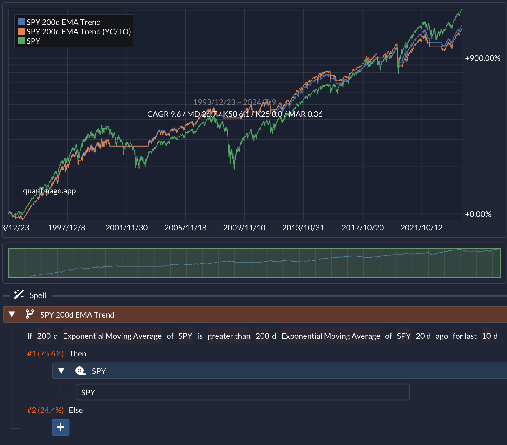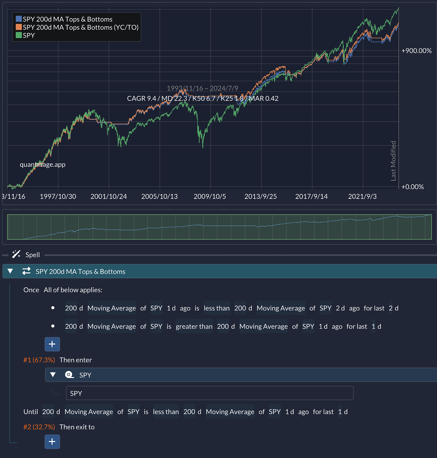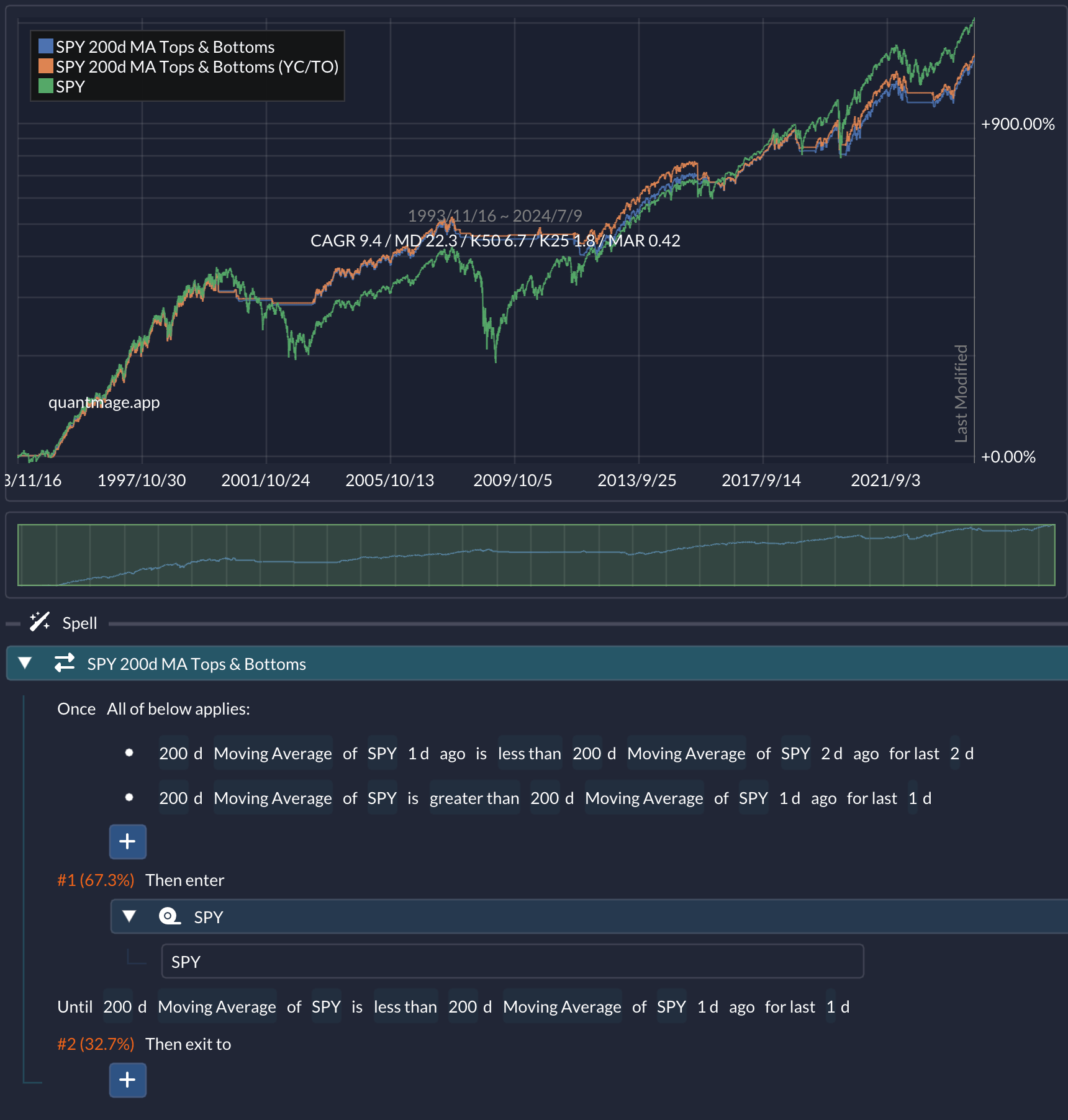 Some argue that detecting the tops and bottoms of a moving average curve is better than using its crossovers. Here, I use 200-day moving averages and check the point where it bounces from its local bottom. It exits the position as soon as the moving average starts its downtrend. Distinct entry and exit conditions are enabled by QuantMage’s Enter/Exit incantation: