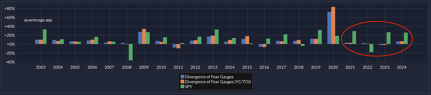 Backtesting showed a decent risk-adjusted return with a CAGR of 8.5% and a max drawdown of 21.3% over a 21-year period. As you can see, it achieved returns comparable to a SPY buy-and-hold but with much less volatility. That said, it's only in the market about 32.4% of the time, so you end up with long, somewhat boring stretches—especially in recent years:
