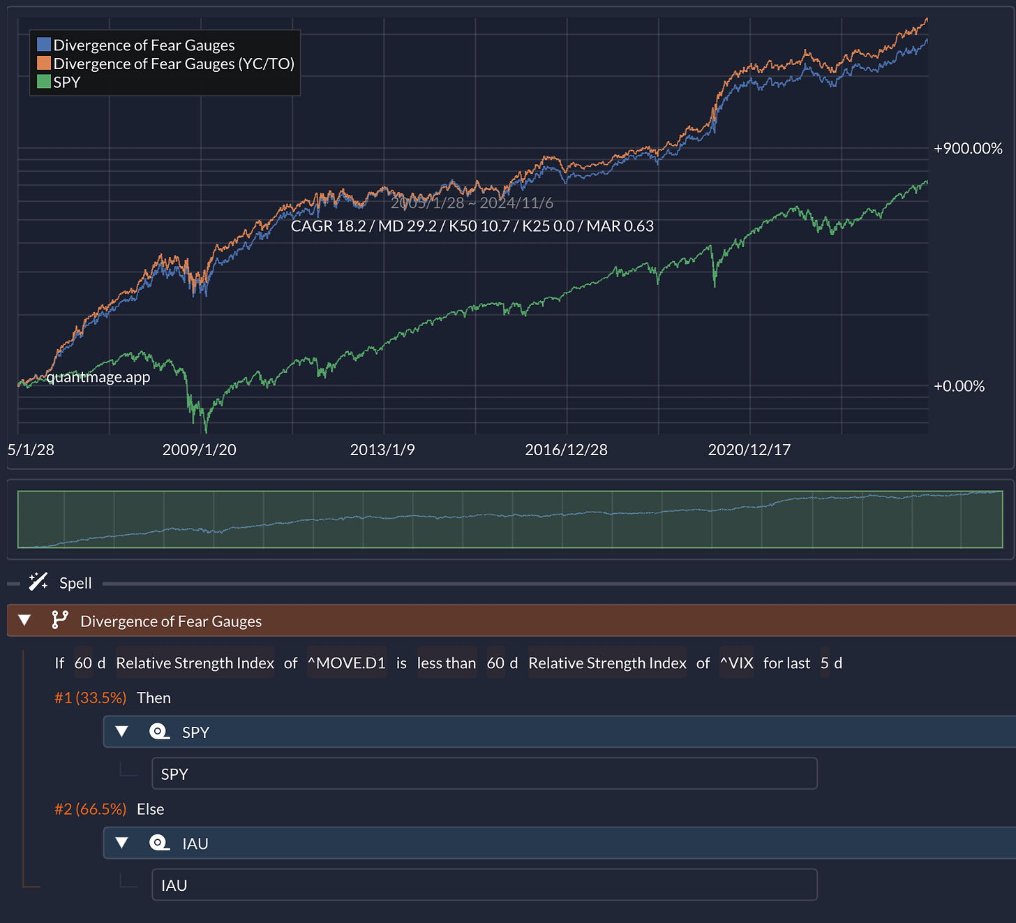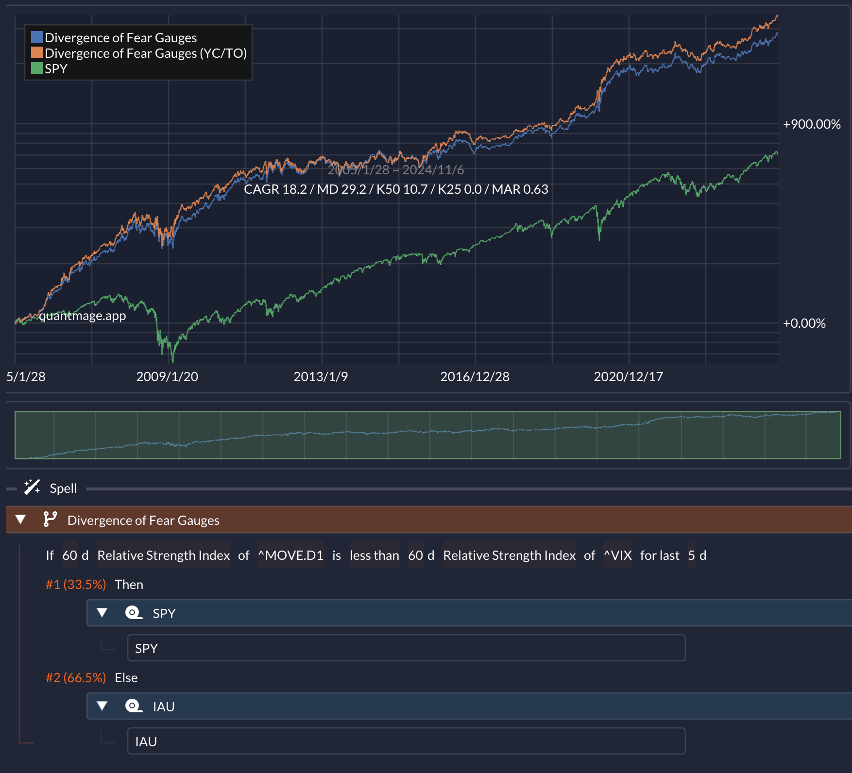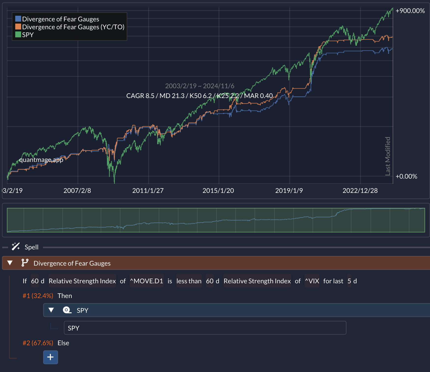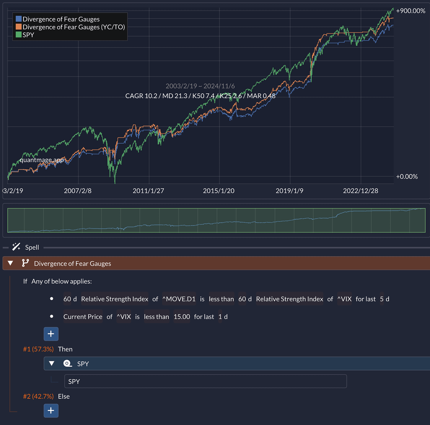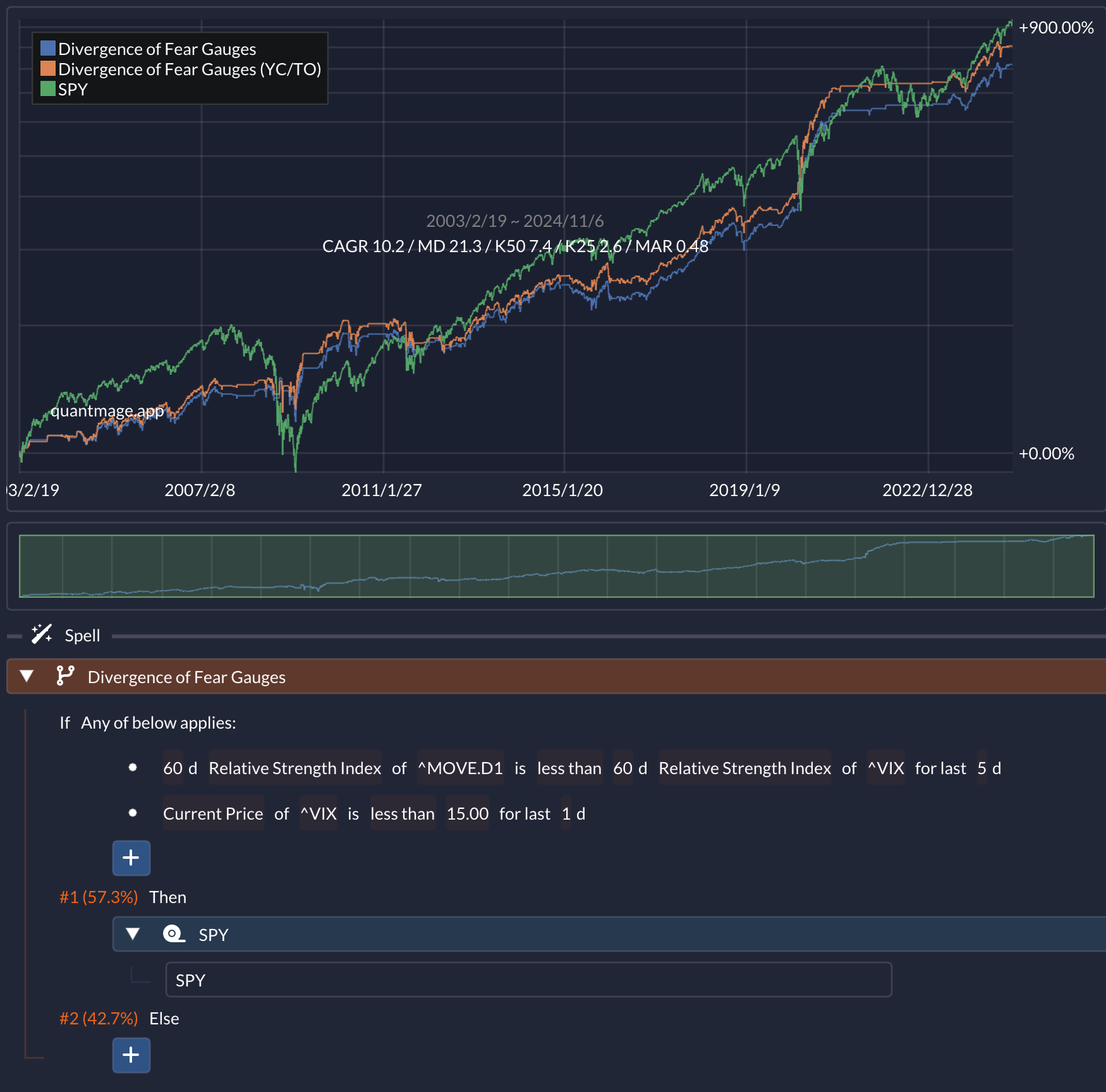 So, I stumbled upon an interesting research paper that digs into the divergence between the MOVE (Merrill Lynch Option Volatility Estimate) Index and the VIX (Chicago Board Options Exchange Volatility Index) as a predictor of future stock market returns. For those not familiar, the MOVE Index is like the "fear gauge" for Treasury bonds, while the VIX serves that role for equities. The paper suggests that when the bond market (measured by MOVE) is more fearful than the equity market (measured by VIX), it can be a bearish signal for stocks. On the flip side, if the bond market is showing less fear, it could be a bullish sign for equities. Naturally, I had to see if this thesis holds water by simulating it in QuantMage.